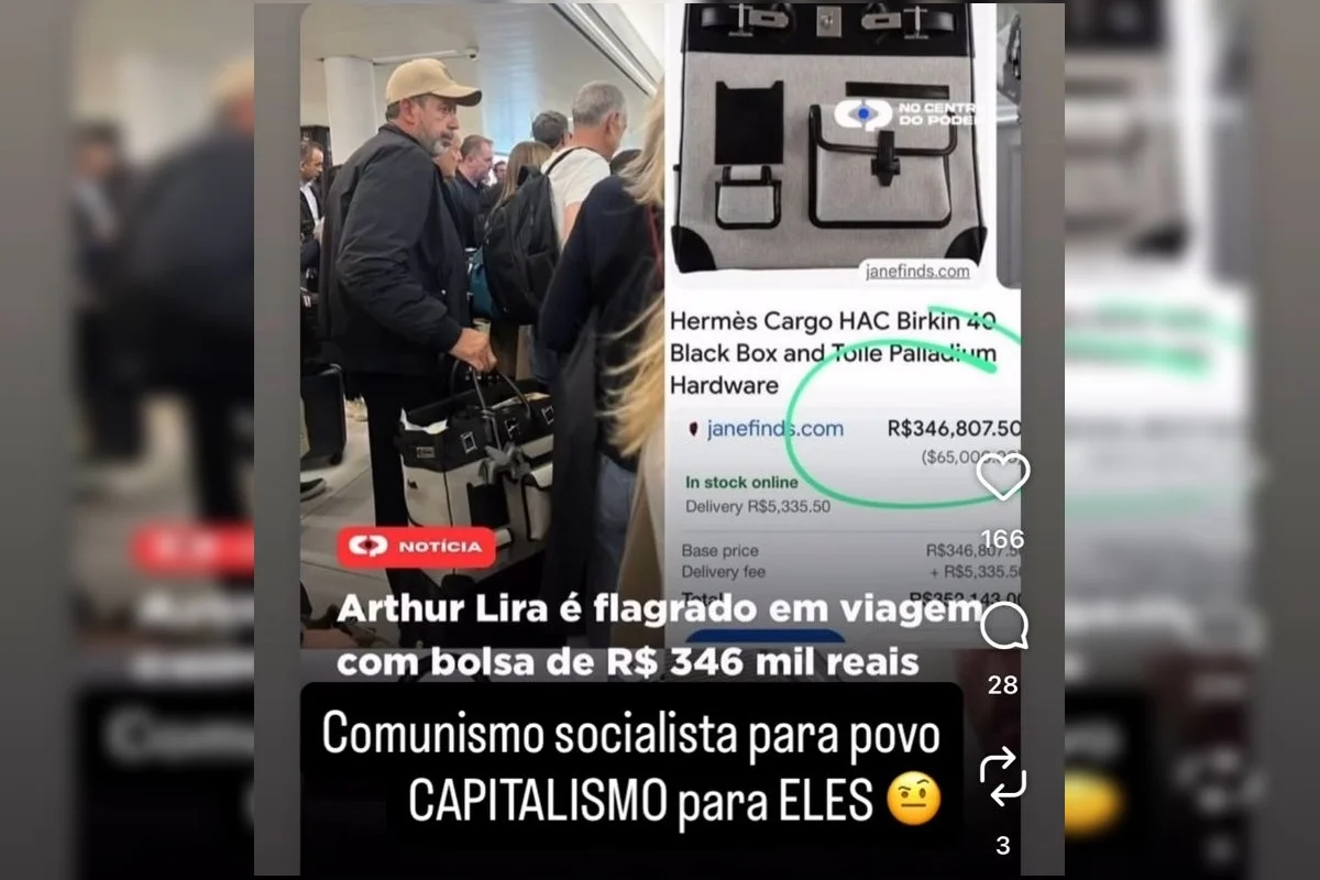 Na imagem, o deputado aparece na fila de embarque de um aeroporto carregando uma bolsa da Hermès avaliada em R$ 346,8 mil. Há variações da montagem — em algumas delas, a bolsa é da marca Prada. A assessoria do deputado disse que “só trata de assuntos institucionais”. Em 2026, ele irá disputar uma vaga para o Senado.