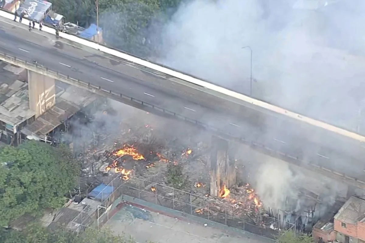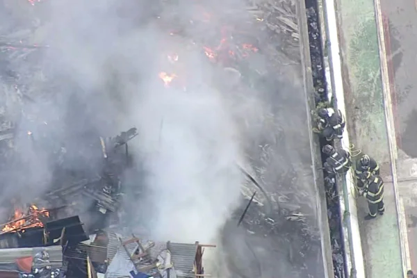 Posicionados sobre o viaduto Domingos Franciulli Netto, que passa por cima da comunidade, bombeiros tentam apagar o fogo que consome as moradias.