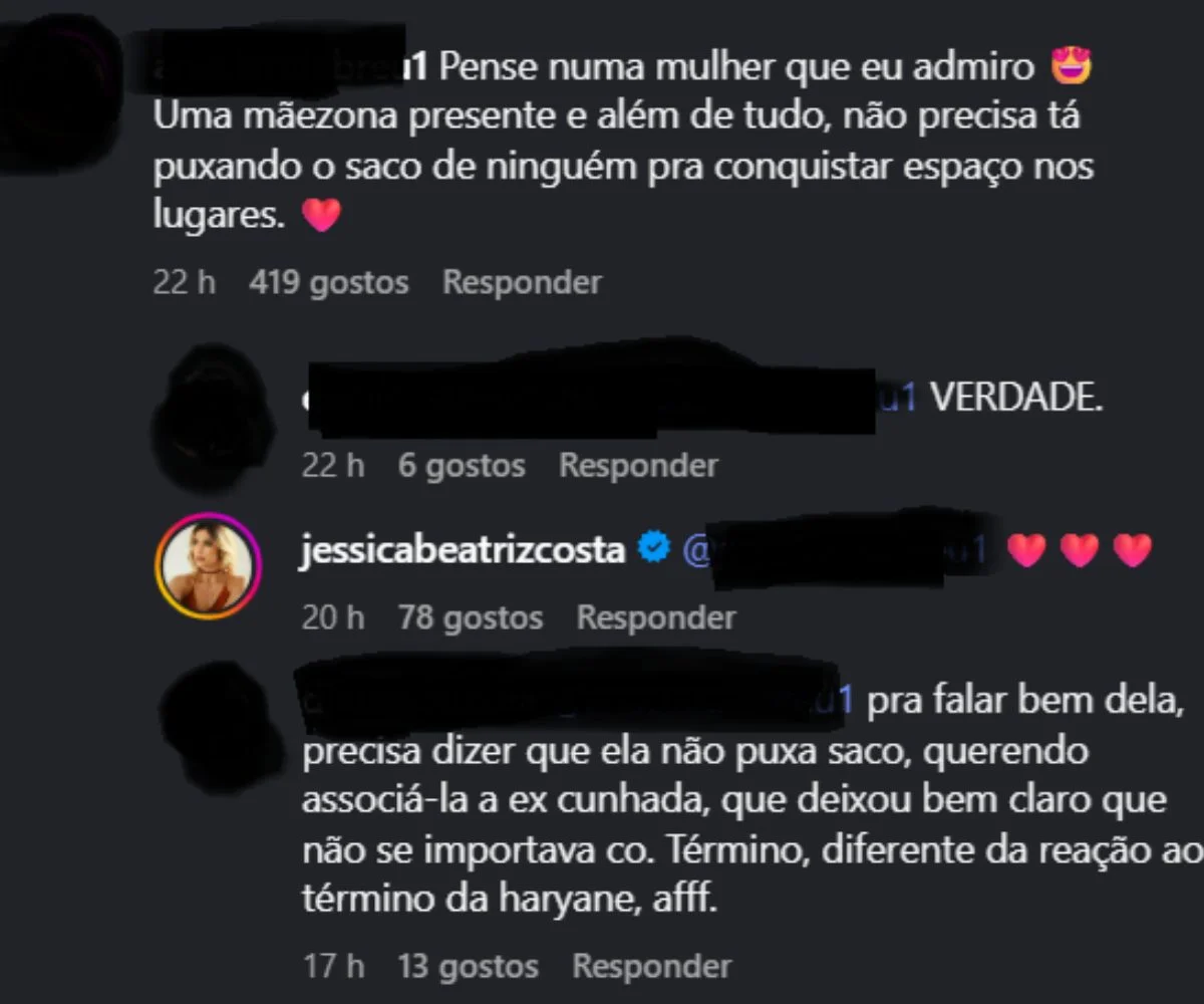 Nos comentários, seguidores deixaram diversos elogios, mas um chamou atenção. Ao exaltar Jessica, a internauta destacou pessoas que não precisam “puxar o saco” de outros para conquistar espaço: