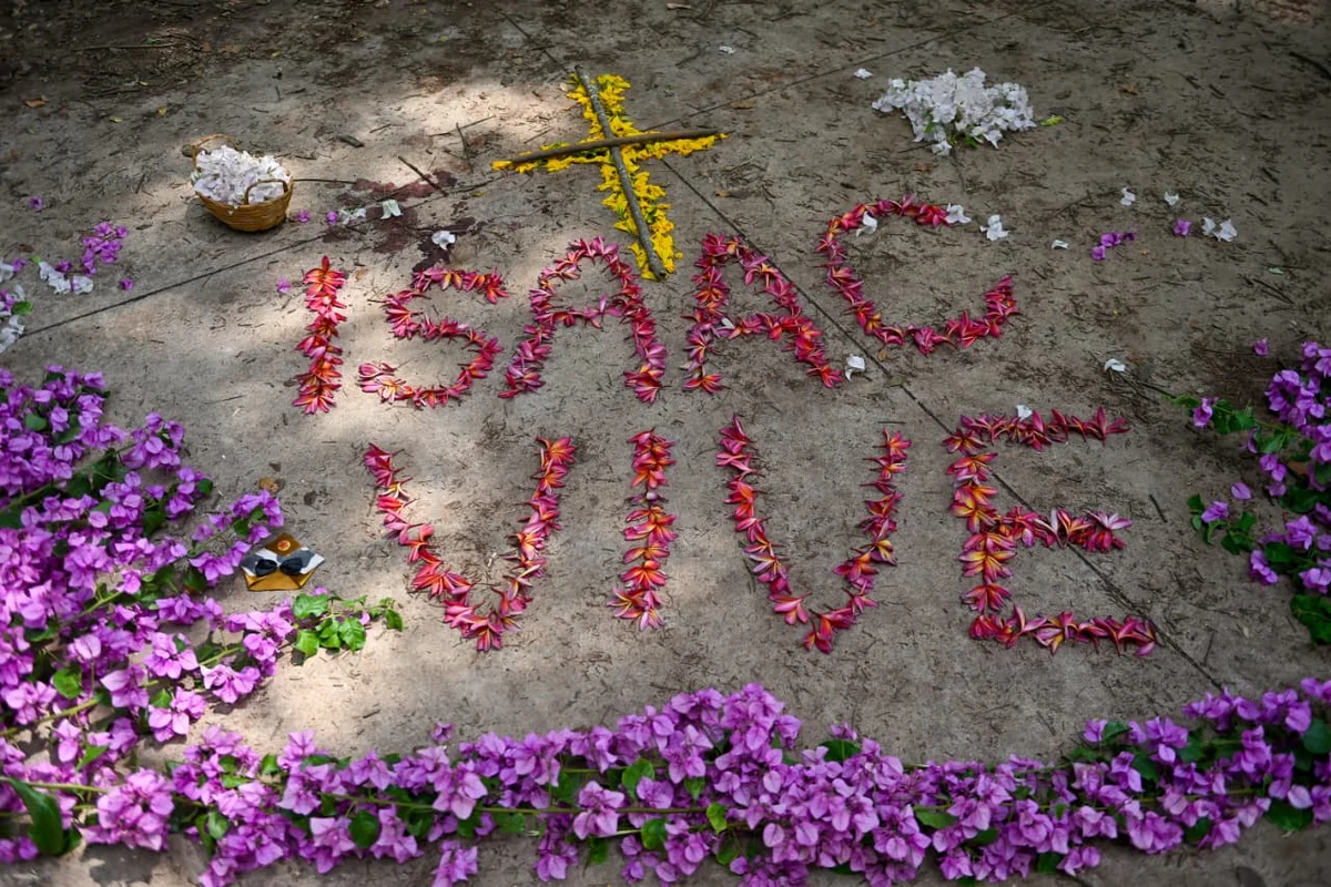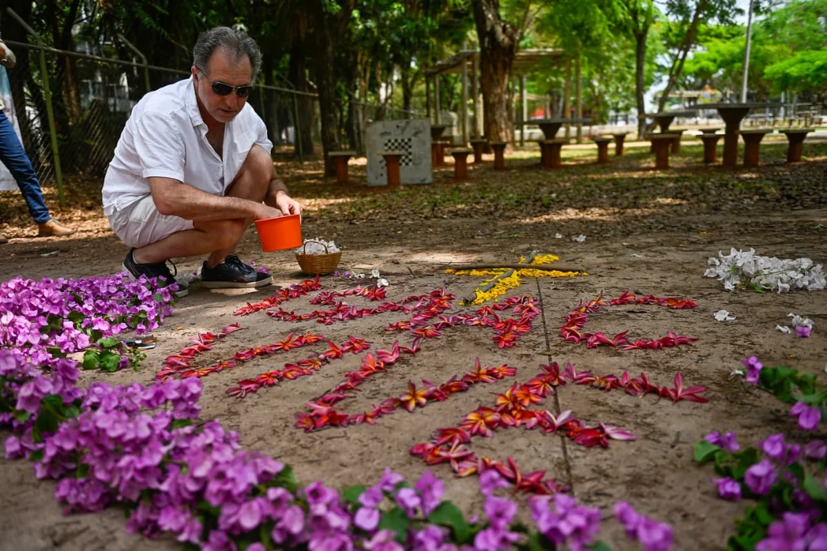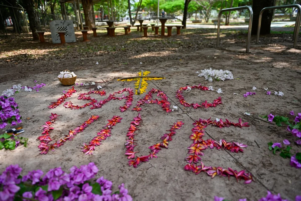 A mensagem foi escrita com pétalas de flores no local onde as manchas de sangue secaram. Santa Fé conta que acordou às 6h deste sábado (18/10) para preparar a mensagem.