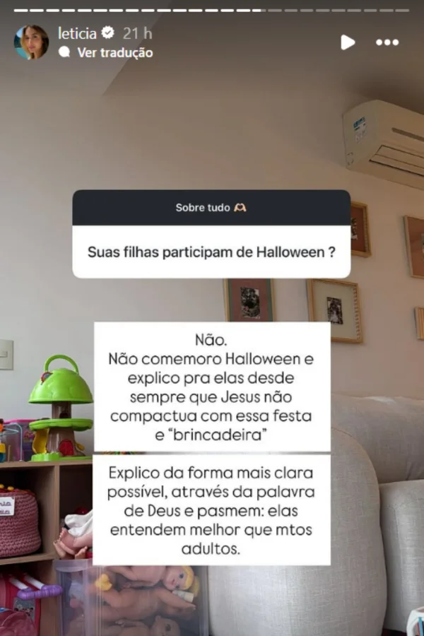 “Não comemoro o Halloween e explico para elas, desde sempre, que Jesus não compactua com essa festa e brincadeira. Explico da forma mais clara possível através da palavra de Deus e, pasmem, elas entendem melhor que muitos adultos”, afirmou.