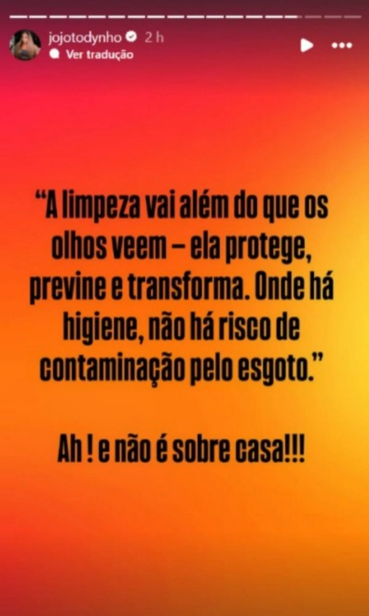 “A limpeza vai além do que os olhos veem — ela protege, previne e transforma. Onde há higiene, não há risco de contaminação pelo esgoto. Ah! E não é sobre casa!!!”, escreveu Jojo.