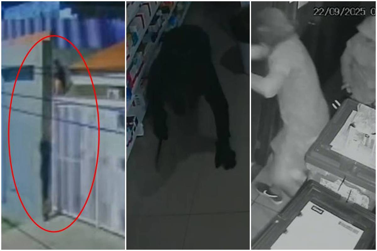 As imagens das câmeras de segurança mostram o momento em que os dois bandidos invadem a farmácia pelo telhado do estabelecimento comercial. Dentro do local, eles se arrastam pelo chão e começam a pegar os medicamentos. Em seguida, os criminosos vão até o cofre da drogaria e furtam o dinheiro que estava lá.