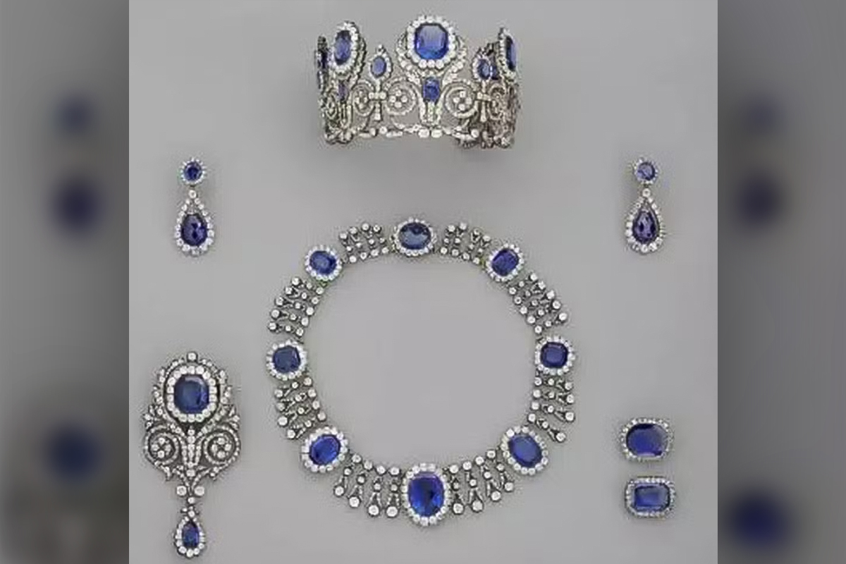 - Coroa com safiras e quase 2.000 diamantes e colar com oito safiras do Sri Lanka e mais de 600 diamantes da rainha consorte Maria Amélia (a foto também exibe brincos e um broche, mas as peças não foram levadas);