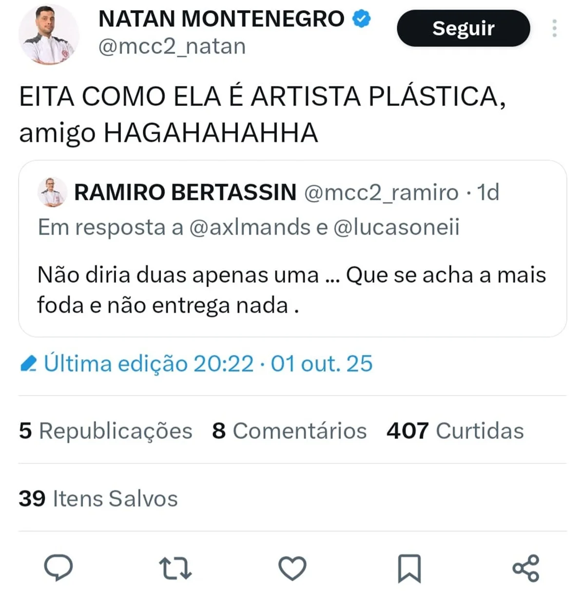 Logo depois, o confeiteiro disparou: “Não diria duas, apenas uma… Que se acha a mais foda e não entrega nada”, detonou. Natan também concordou e debochou: “Eita como ela é artista plástica, amigo Hahahaha”, postou.