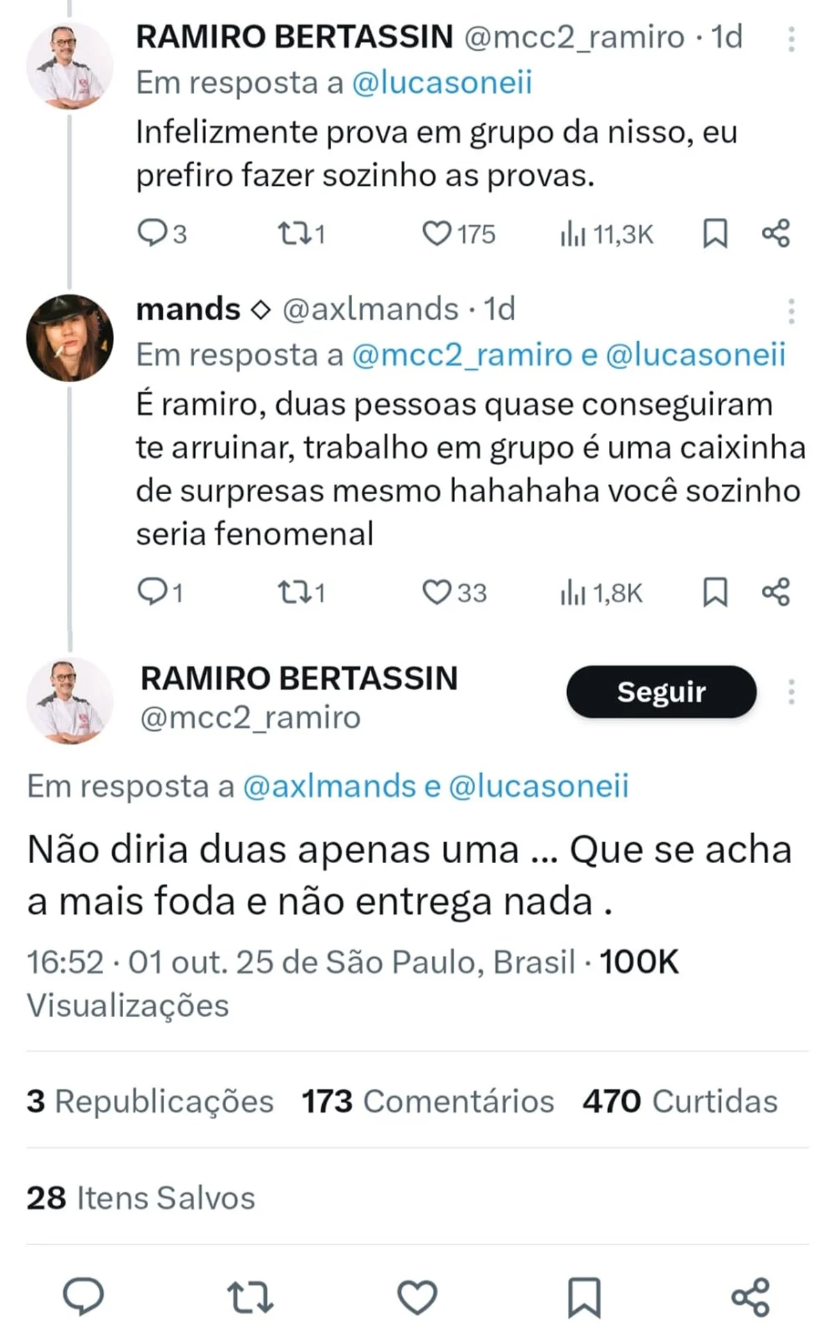 E as alfinetadas seguiram: “Infelizmente, prova em grupo dá nisso. Eu prefiro fazer sozinho as provas’, escreveu Ramiro. Uma outra fã, então, observou: “É, Ramiro, duas pessoas quase conseguiram te arruinar. Trabalho em grupo é uma caixinha de surpresas mesmo hahahaha. Você sozinho seria fenomenal”, elogiou.