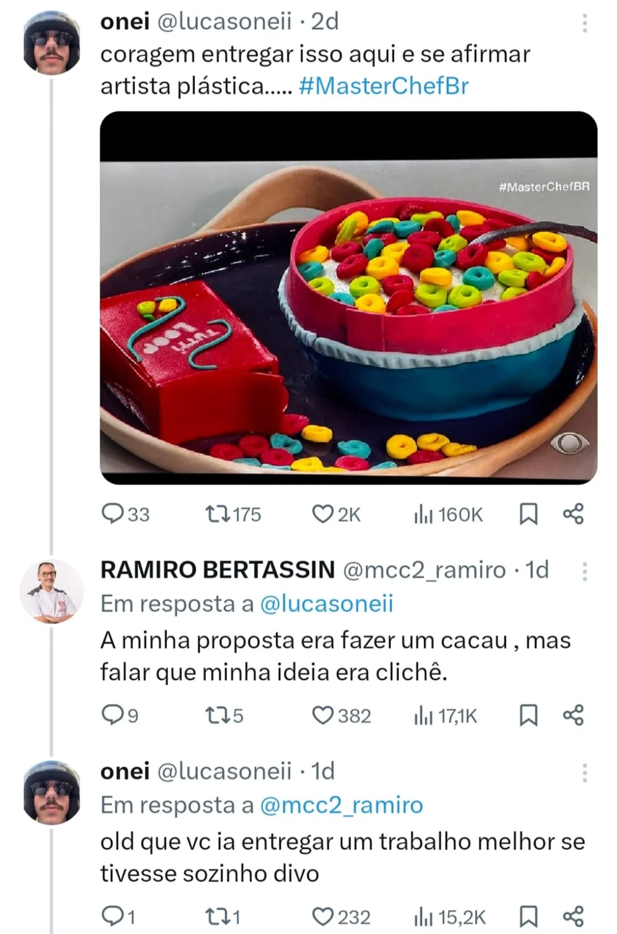 Além da troca de farpas no programa, a treta ultrapassou os limites da televisão e foi parar nas redes sociais. Um seguidor de Ramiro no X, antigo Twitter, debochou do resultado da confeiteira: “Coragem entregar isso aqui e se afirmar artista plástica…”, escreveu o rapaz.