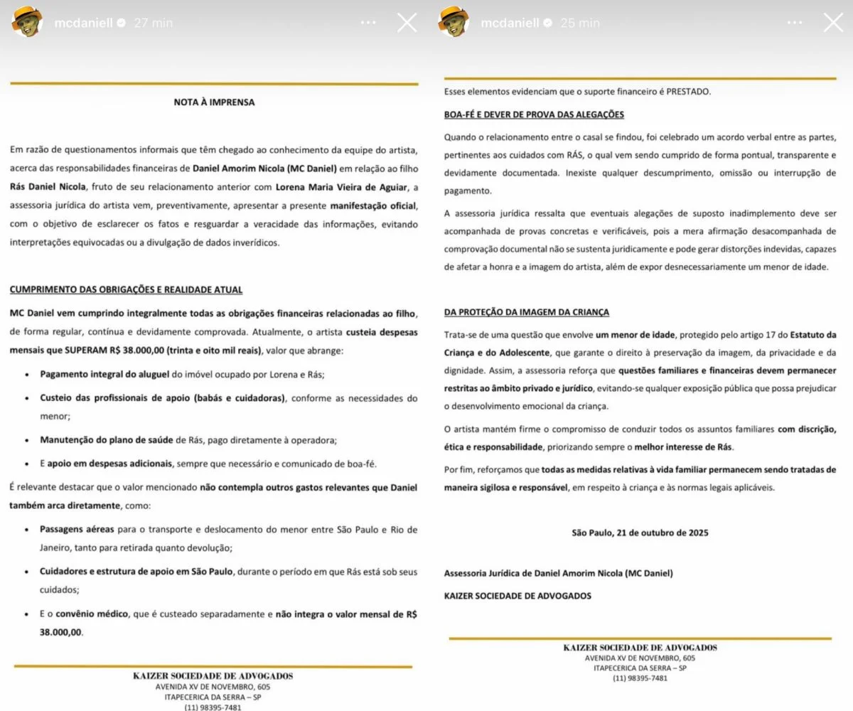 Após as declarações da influenciadora Lorena Maria sobre suposta sobrecarga financeira e cuidados com o filho Rás, MC Daniel se manifestou oficialmente por meio de sua assessoria jurídica.