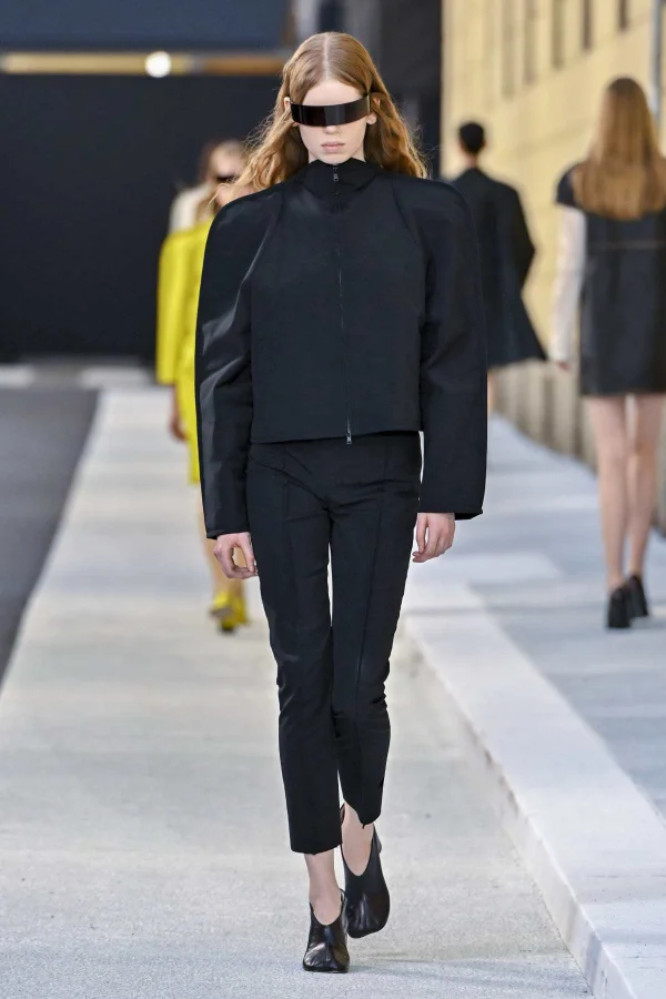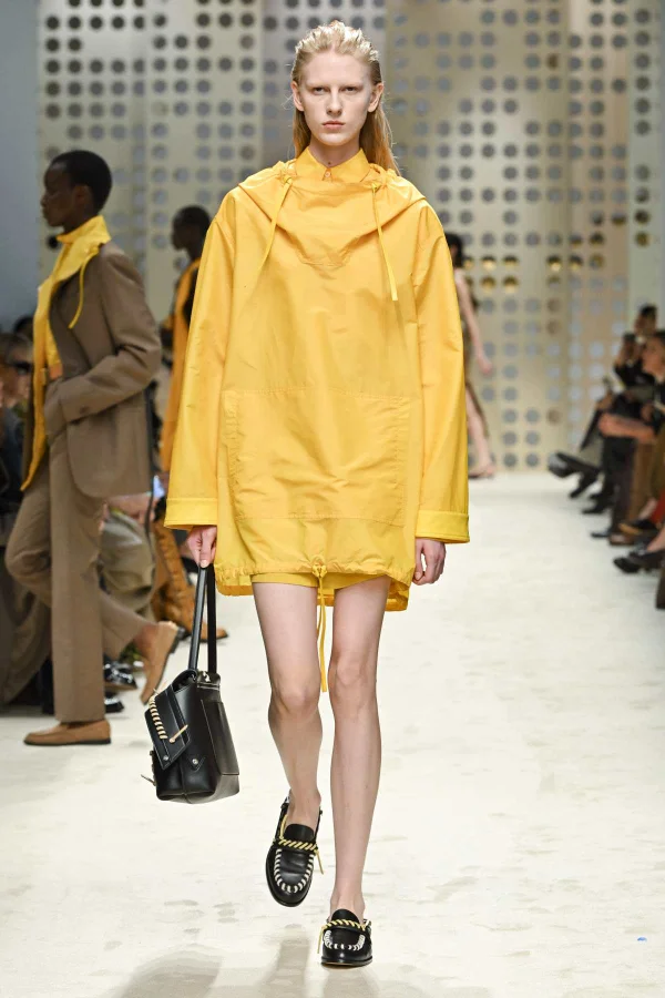 O amarelo foi usado tanto em detalhes e acessórios, quanto em algumas peças principais. Em maioria, tons vibrantes foram destacados, com direito à um casaco da Onitsuka Tiger, muito similar à jaqueta usada pela personagem Beatrix Kiddo (Uma Thurman) no linga Kill Bill, de Quentinn Tarantino.