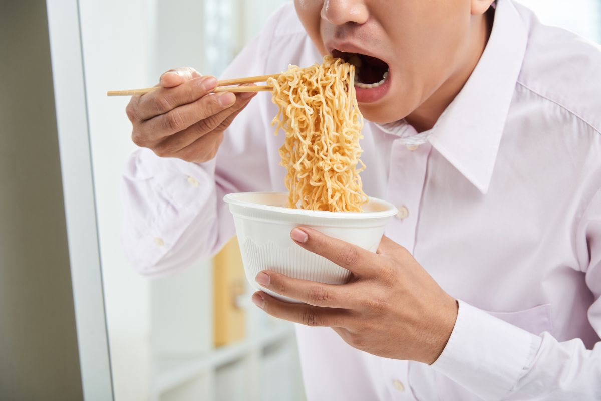 Cozinhe um miojo de tomate (ou o sabor que preferir).