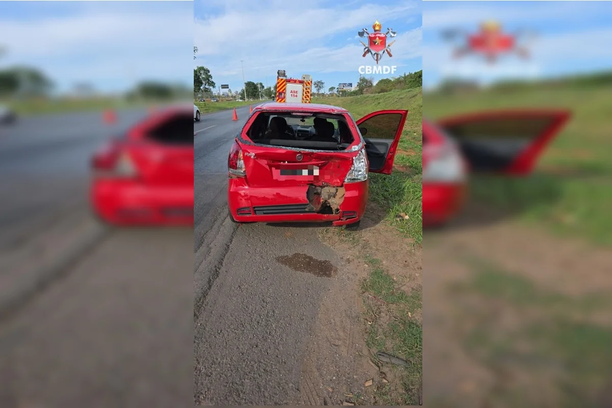 O motorista do veículo envolvido no acidente foi avaliado pela equipe médica, mas não necessitou de atendimento. Na imagem divulgada pelo CBMDF é possível ver a traseira do carro destruída e o vidro completamente quebrado.