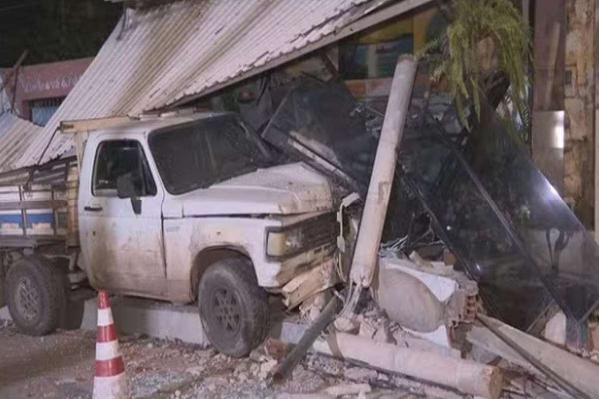 O veículo invadiu um comércio, chegando a causar desabamento do telhado em parte do local.