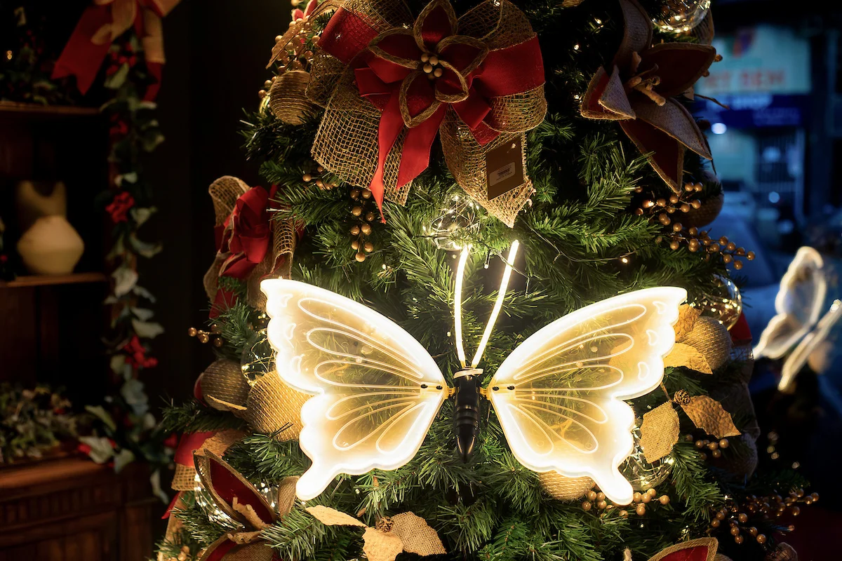 Um dos destaques foram os tufos de iluminação aplicados entre as folhagens, que criam um efeito cintilante e sofisticado. As árvores, por sua vez, ganharam versões diferenciadas, algumas sem laços, apenas com bolas metálicas e ornamentos inspirados em borboletas douradas.
