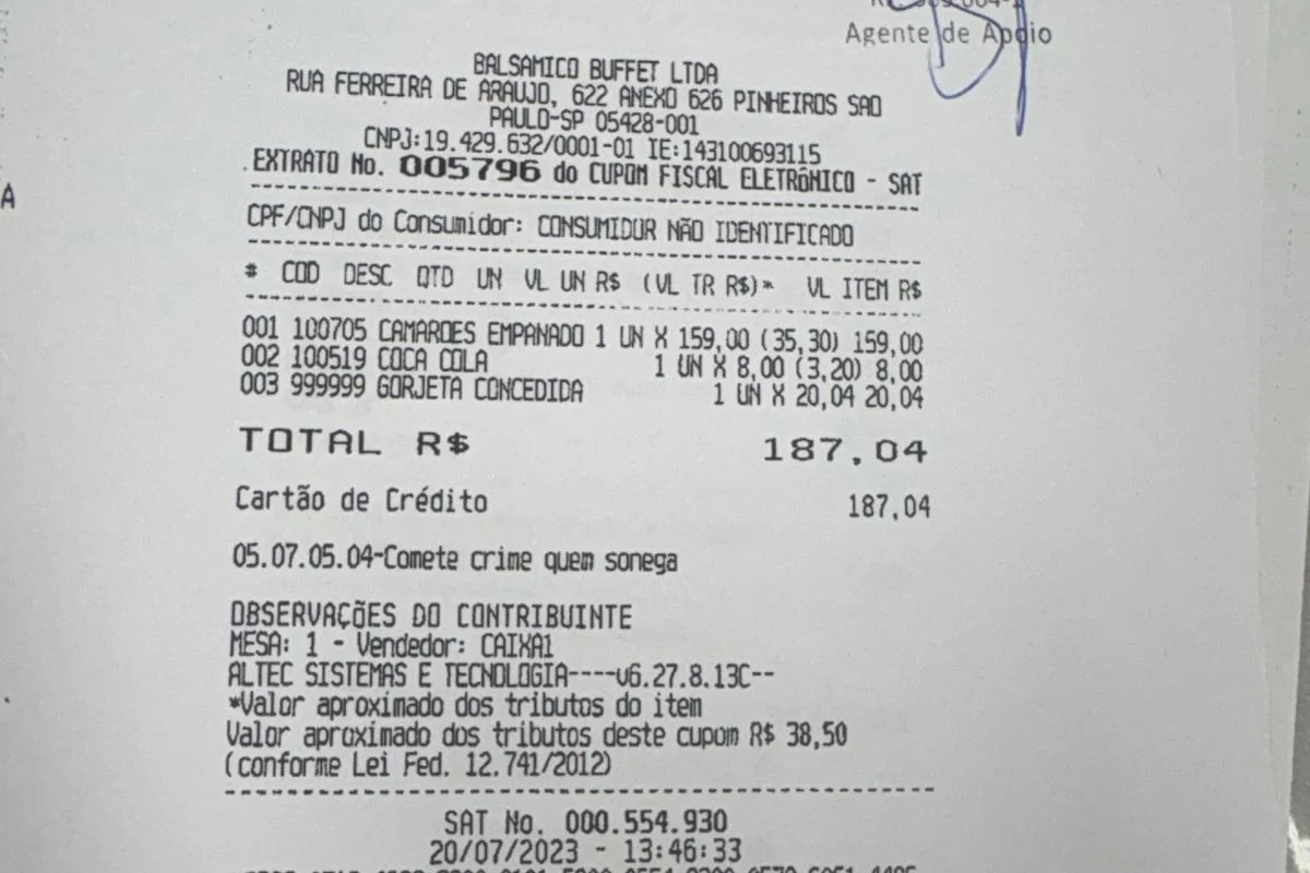 Nota fiscal de restaurante usada na prestação de contas do Jockey Club