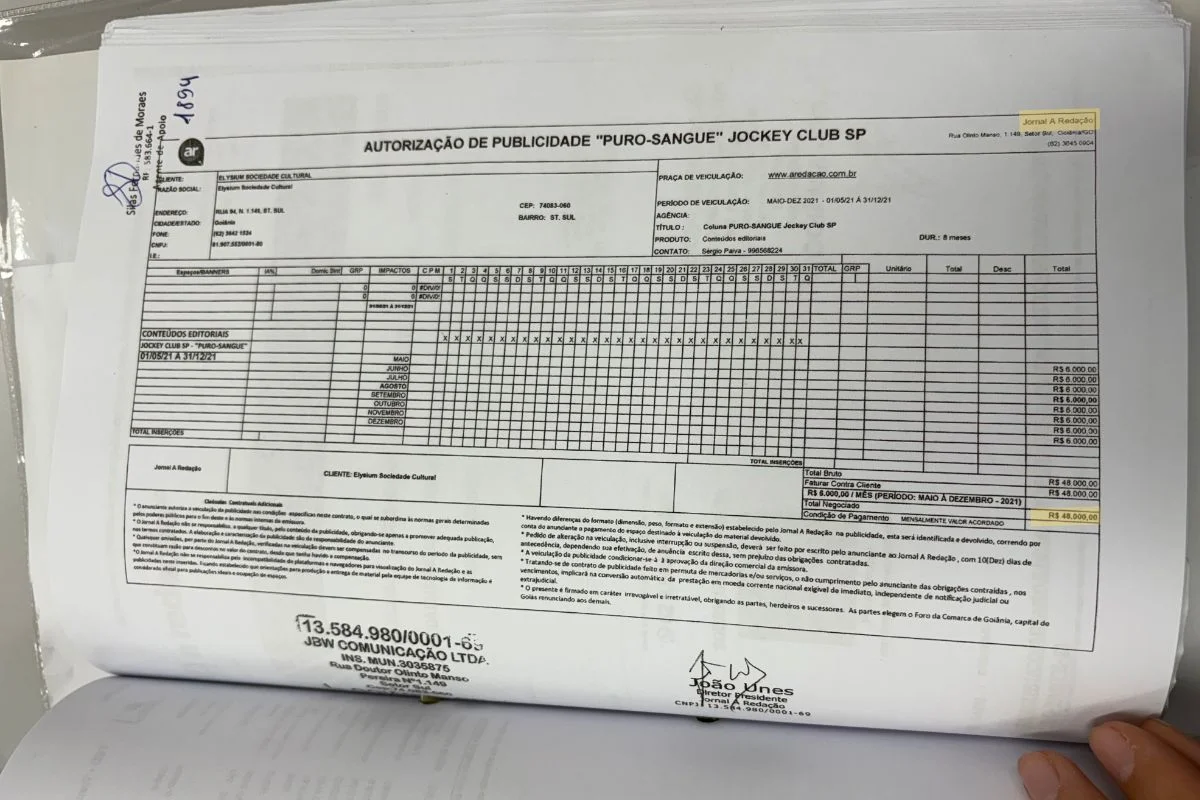 Pela prestação de contas, não é possível saber por quanto tempo Elysium bancou contas administrativas do jornal. Apesar de estar registrado em Goiânia e cobrir notícias locais, as notas fiscais mostram que a publicação recebeu ao menos R$ 48 mil para publicar “Conteúdos Editoriais” relacionados ao Jockey em uma das suas colunas.