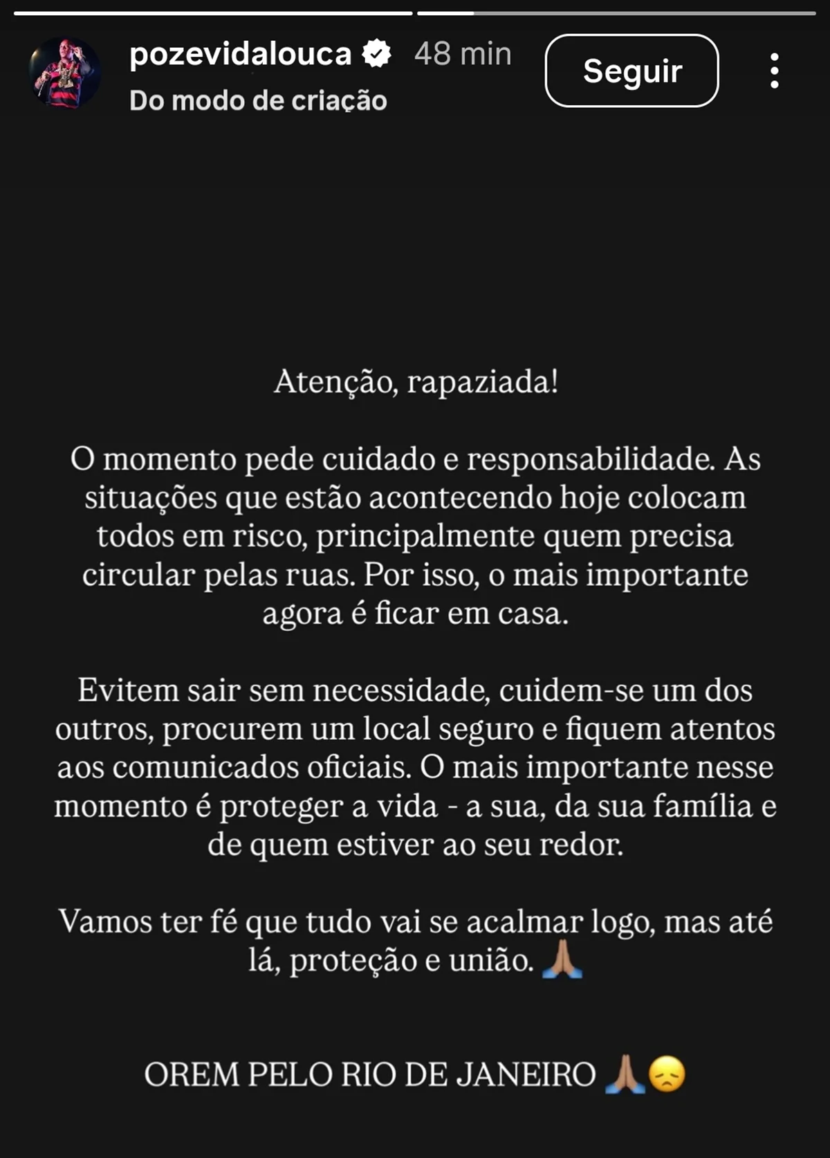 “Evitem sair sem necessidade, cuidem-se um dos outros, procurem um local seguro e fiquem atentos aos comunicados oficiais. O mais importante nesse momento é proteger a vida – a sua, da sua família e de quem estiver ao seu redor. Vamos ter fé que tudo vai se acalmar logo, mas até lá, proteção e união. OREM PELO RIO DE JANEIRO”, completou na mensagem.