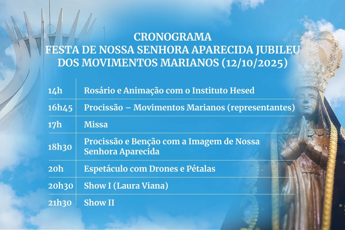 A Catedral Metropolitana de Brasília se prepara para celebrar, entre os dias 3 e 12 de outubro, a tradicional Festa de Nossa Senhora Aparecida, a padroeira do Brasil e da Arquidiocese de Brasília. A programação, que acontece na Catedral e na Esplanada dos Ministérios, promete reunir milhares de fiéis em momentos de oração, celebração, cultura e lazer.