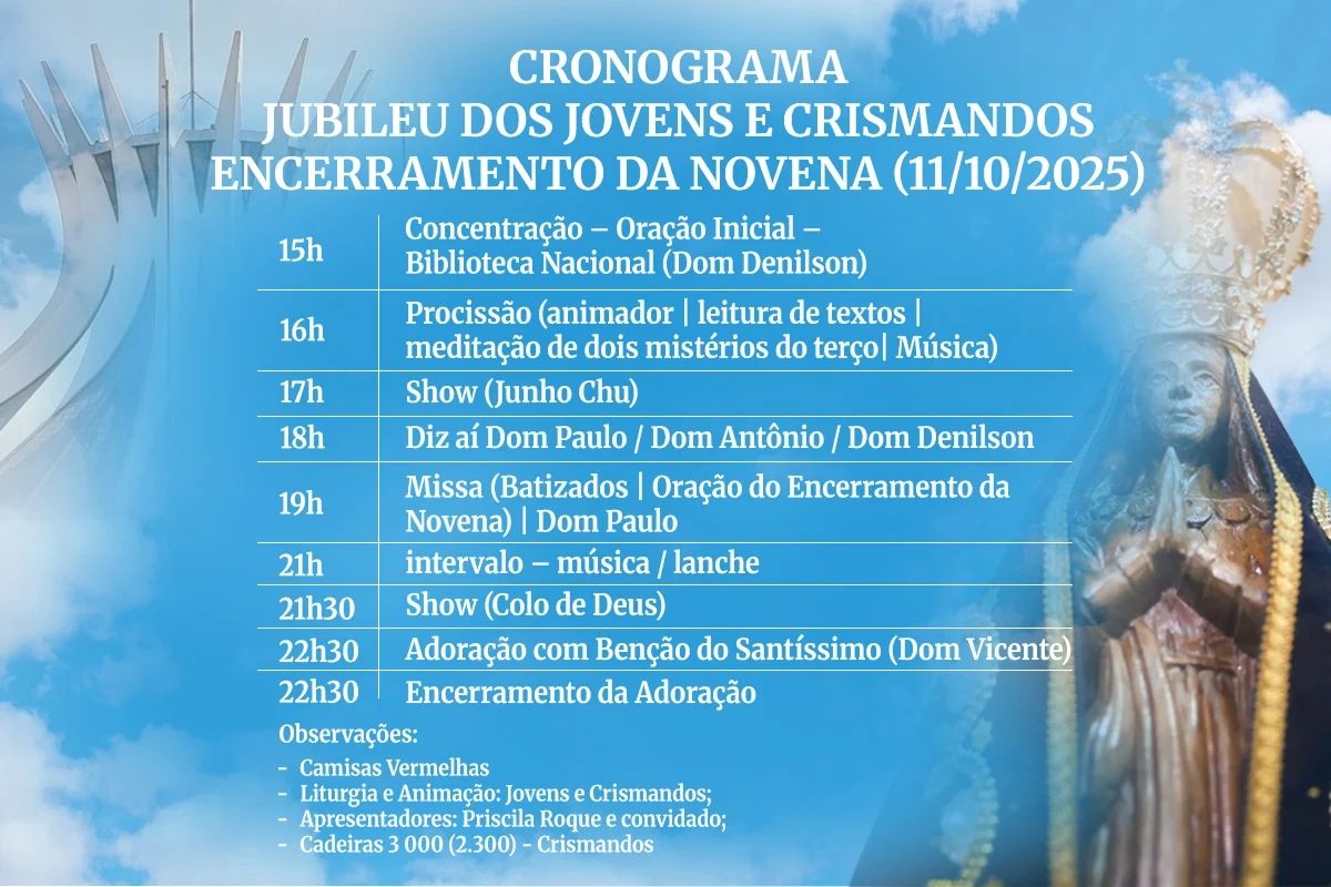 A juventude ganha atenção especial no dia 11 de outubro, com o Jubileu da Juventude, que promete reunir cerca de 20 mil jovens em procissão e shows com bandas católicas.