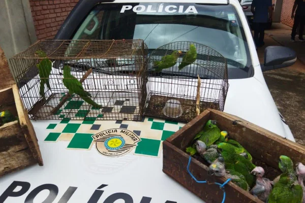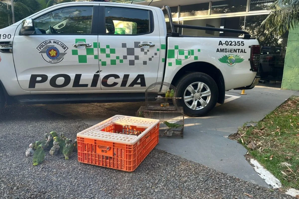 A Polícia Militar Ambiental resgatou, em um assentamento em Teodoro Sampaio, interior de São Paulo, 22 filhotes de papagaio-verdadeiro. As aves estavam escondidas em um dos lotes. Pai e filho, identificados como responsáveis pelo tráfico de animais silvestres, foram multados em R$ 182 mil.