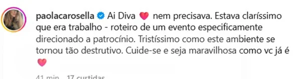 Nos comentários da postagem, Paola Carosella, que já foi jurada do MasterChef Brasil, defendeu a amiga. “Ai Diva, nem precisava [se desculpar]. Estava claríssimo que era trabalho – roteiro de um evento especificamente direcionado a patrocínio. Tristíssimo como este ambiente se tornou tão destrutivo. Cuide-se e seja maravilhosa como você já é”, escreveu a ex-jurada do MasterChef Brasil.
