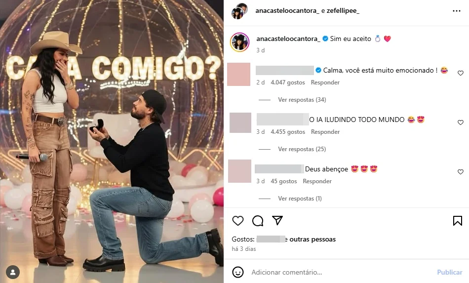 Com a repercussão do possível romance, perfis falsos aproveitaram o momento para espalhar informações enganosas. Um desses perfis, com mais de 500 mil seguidores, publicou imagens criadas por inteligência artificial mostrando um suposto pedido de namoro feito por Zé a Ana Castela. Na foto, o filho de Leonardo aparece ajoelhado, segurando uma aliança.