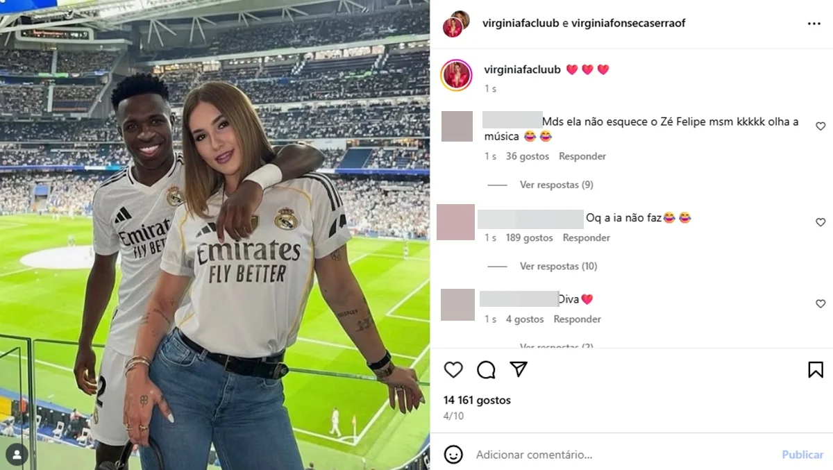 Um perfil falso de Virginia publicou uma imagem feita com IA da influenciadora beijando Vini Jr.