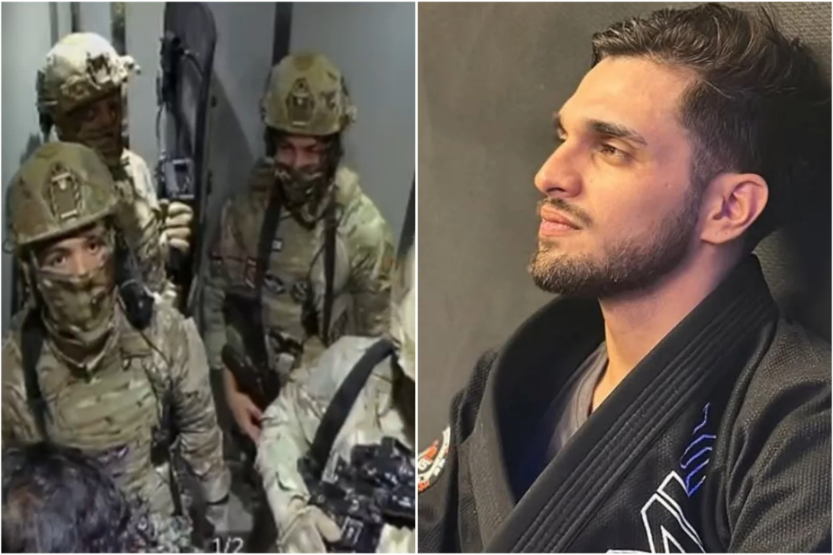 O grupo, que usava uniformes de camuflagem militar, capacetes táticos e coletes à prova de balas, é visto se deslocando até o prédio de Marcello.