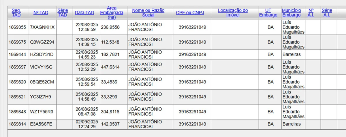 O empresário João Franciosi teve recentemente 1,5 mil hectares de suas propriedades embargadas pelo Ibama por desmatamento ilegal. A área corresponde a 1,5 mil campos de futebol. Ao todo, foram oito embargos neste ano, em uma operação do órgão ambiental que se estendeu entre os dias 22 de agosto e 3 de setembro. As áreas embargadas de Franciosi estão localizadas nas cidades baianas de Luiz Eduardo Magalhães e Barreiras.