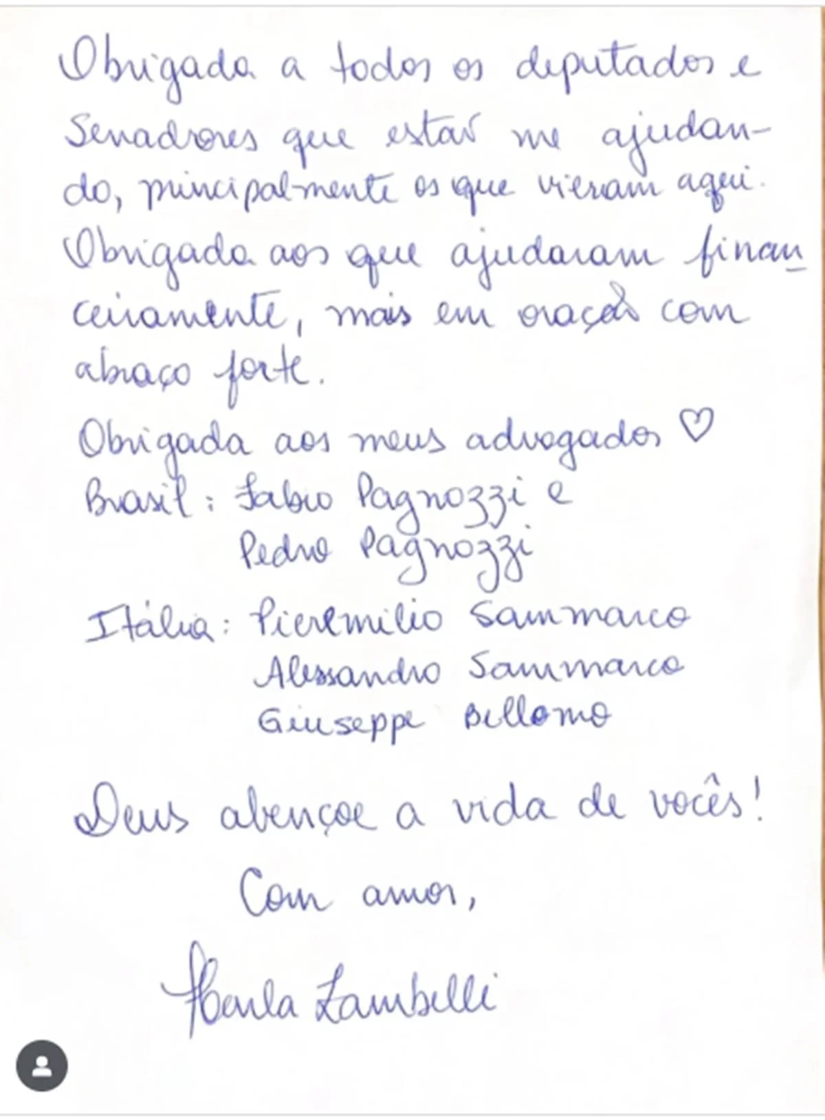 No documento, publicado nas redes sociais pela mãe da parlamentar, Rita Zambelli, a deputada agradece a seus advogados e aos parlamentares aos que a ajudaram com doações financeiras e com orações.