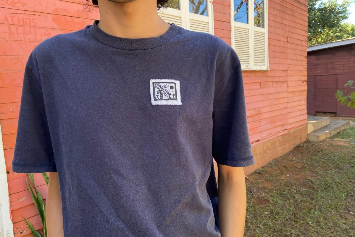 Aluno Fernando Pedra, integrante do Gravura em Foco, exibe camisa com estampa feita por ele