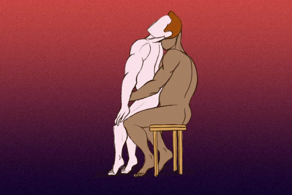 Aqui uma pessoa senta por cima da outra, de frente para ela e a abraçando com as pernas. Quem fica por cima controla a penetração, e a posição ainda permite beijos e trocas de carícias