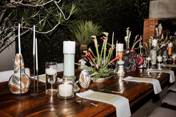 Em entrevista à coluna Claudia Meireles, Júlia revelou que buscou fazer uma decoração orgânica e que dialogasse bem com a estética de Brennand. Diversos itens do artista foram utilizados para compor o centro das mesas, além de velas.