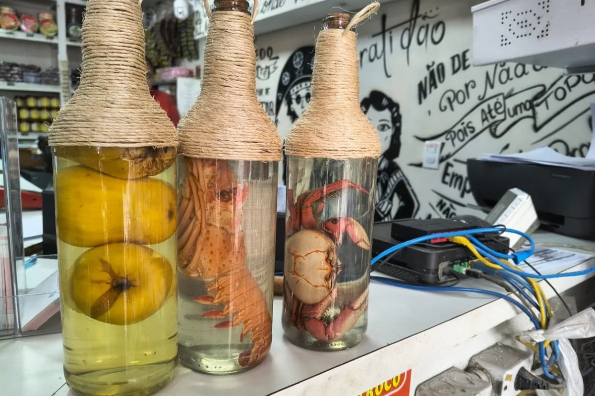 Além das “pingas de piada”, a reportagem encontrou também aguardente com bicho dentro da garrafa. Com preços que variam entre R$ 40 e R$ 80, elas contam com lagosta ou caranguejo no interior dos vasilhames. Também são conhecidas aquelas que têm cobras no interior, mas essas não foram localizadas na última semana.