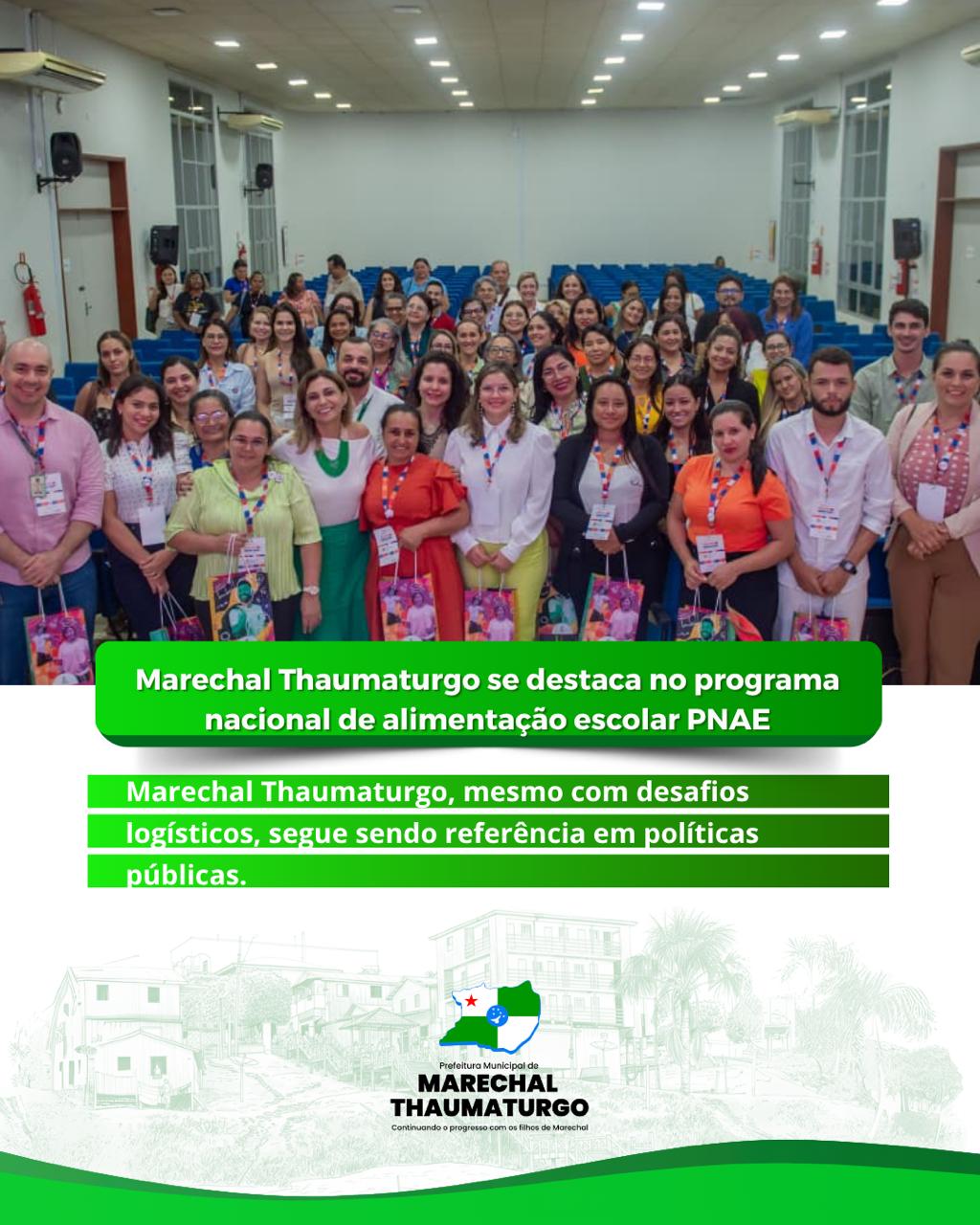 Mesmo diante dos grandes desafios logísticos enfrentados pela região, a Prefeitura de Marechal Thaumaturgo tem se destacado em nível nacional pela excelência na execução do Programa Nacional de Alimentação Escolar (PNAE). Sob a liderança do prefeito Valdelio Furtado, o município tem servido de exemplo na implementação de políticas públicas voltadas à segurança alimentar, valorização da agricultura familiar e fortalecimento da cultura local.