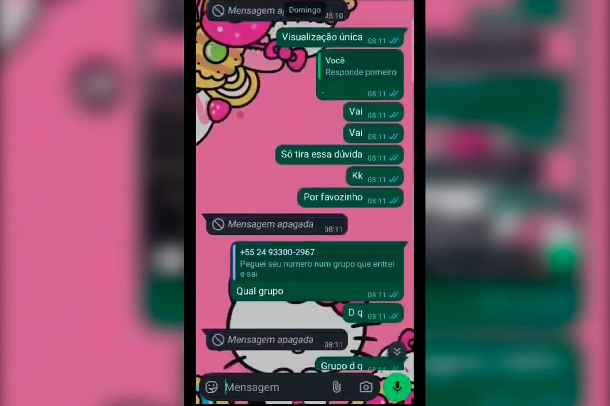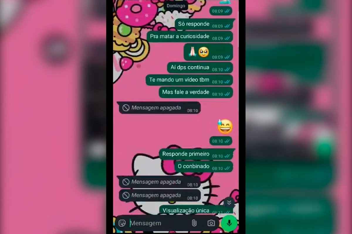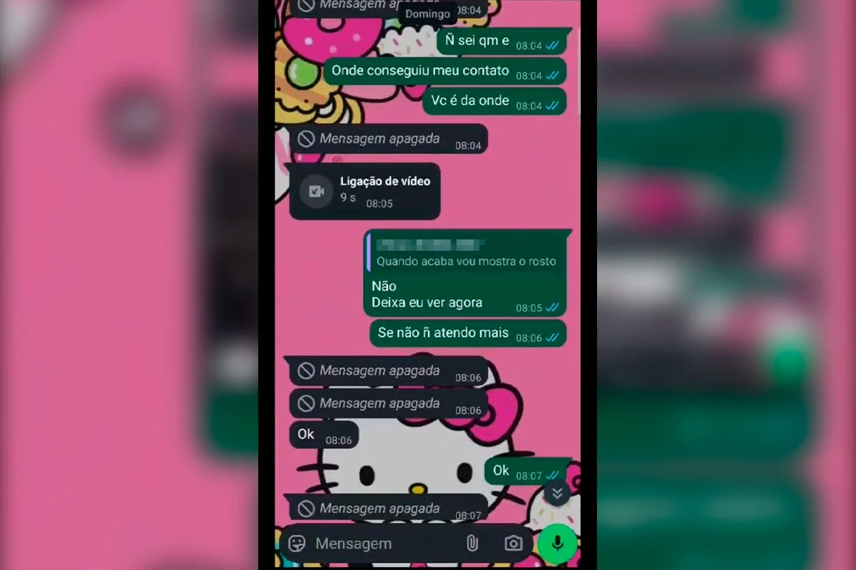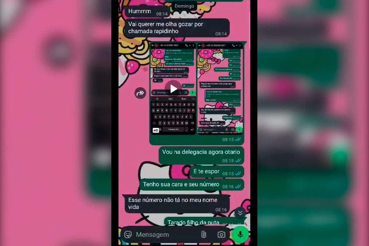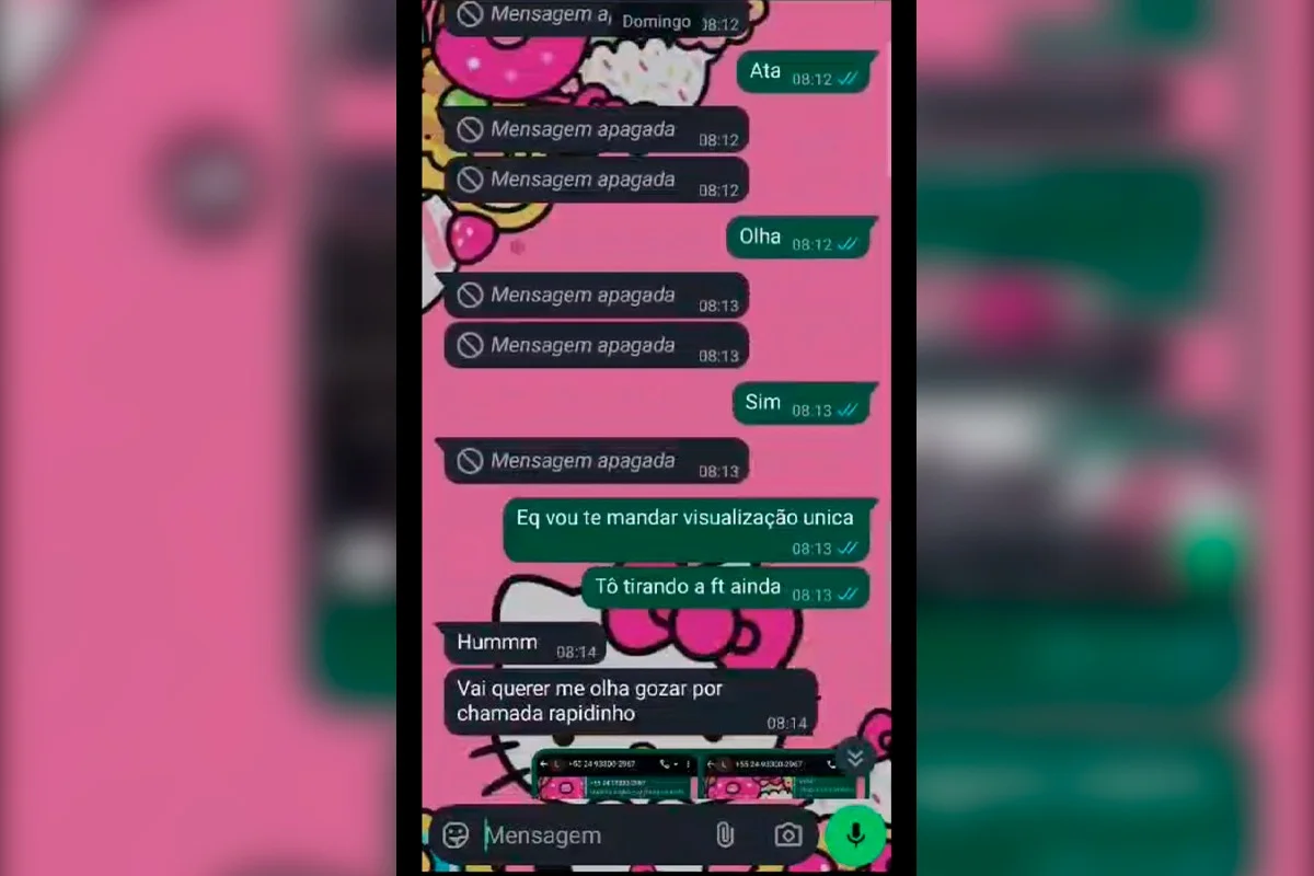 No WhatsApp, o homem se identificou como Lucas, disse ser morador do Rio de Janeiro e escreveu: “Não fala nada. Só olha. Se quiser mostra também. Vou gozar mais gostoso”. Ele afirmou que pegou o número da vítima em um grupo de doações do Distrito Federal.
