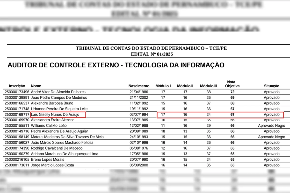 O Tribunal de Contas de Pernambuco (TCE-PE) se pronunciou, nesta terça-feira (7/10), após vir a público a notícia de que o nome de Laís Giselly Nunes de Araújo (foto em destaque), de 31 anos, aparece na lista de aprovados para o cargo de analista de controle externo do órgão.
