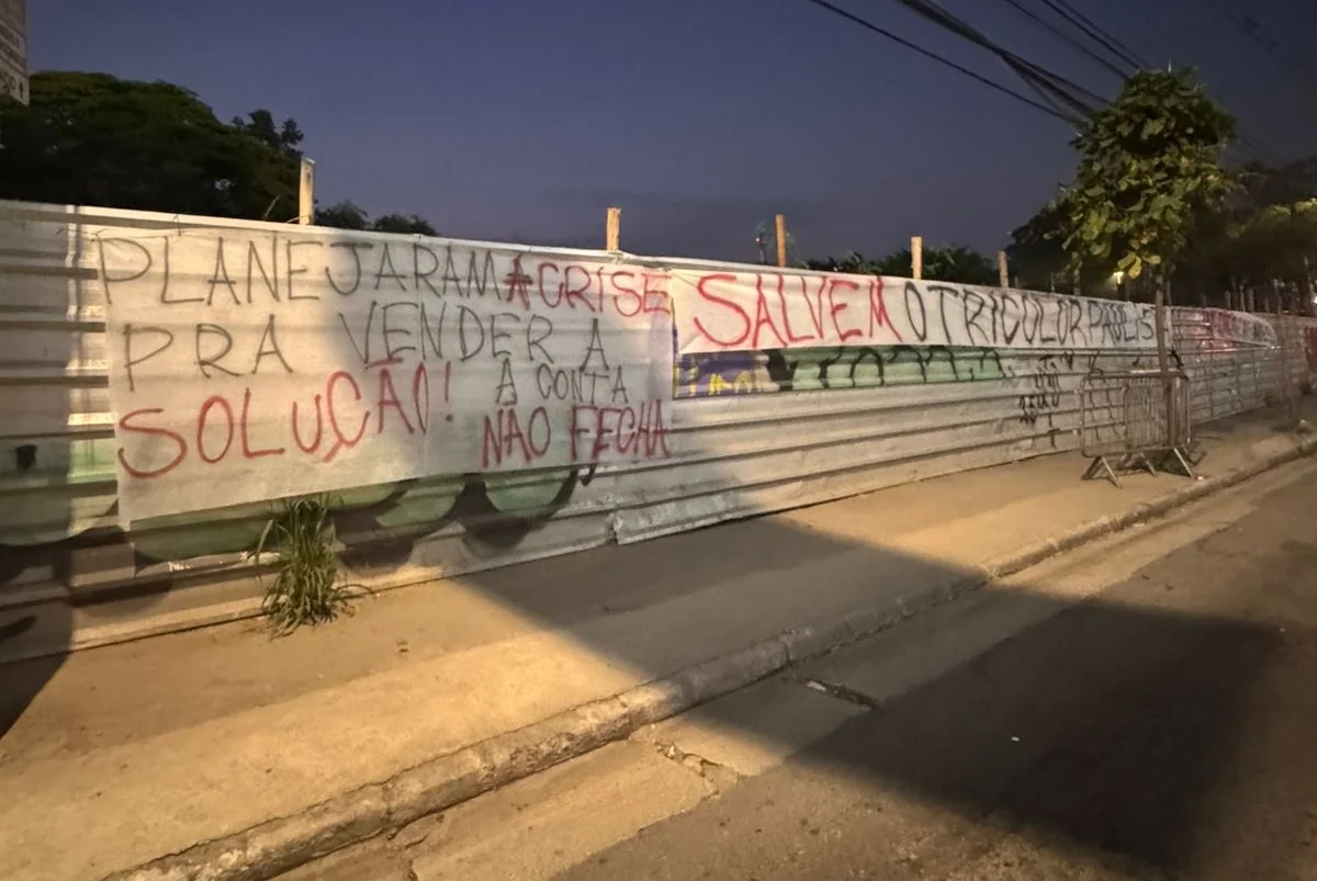 Frases como “gestão criminosa”, “planejaram a crise pra vender a solução! A conta não fecha!” e “salvem o Tricolor Paulista” foram escritas nos panos.