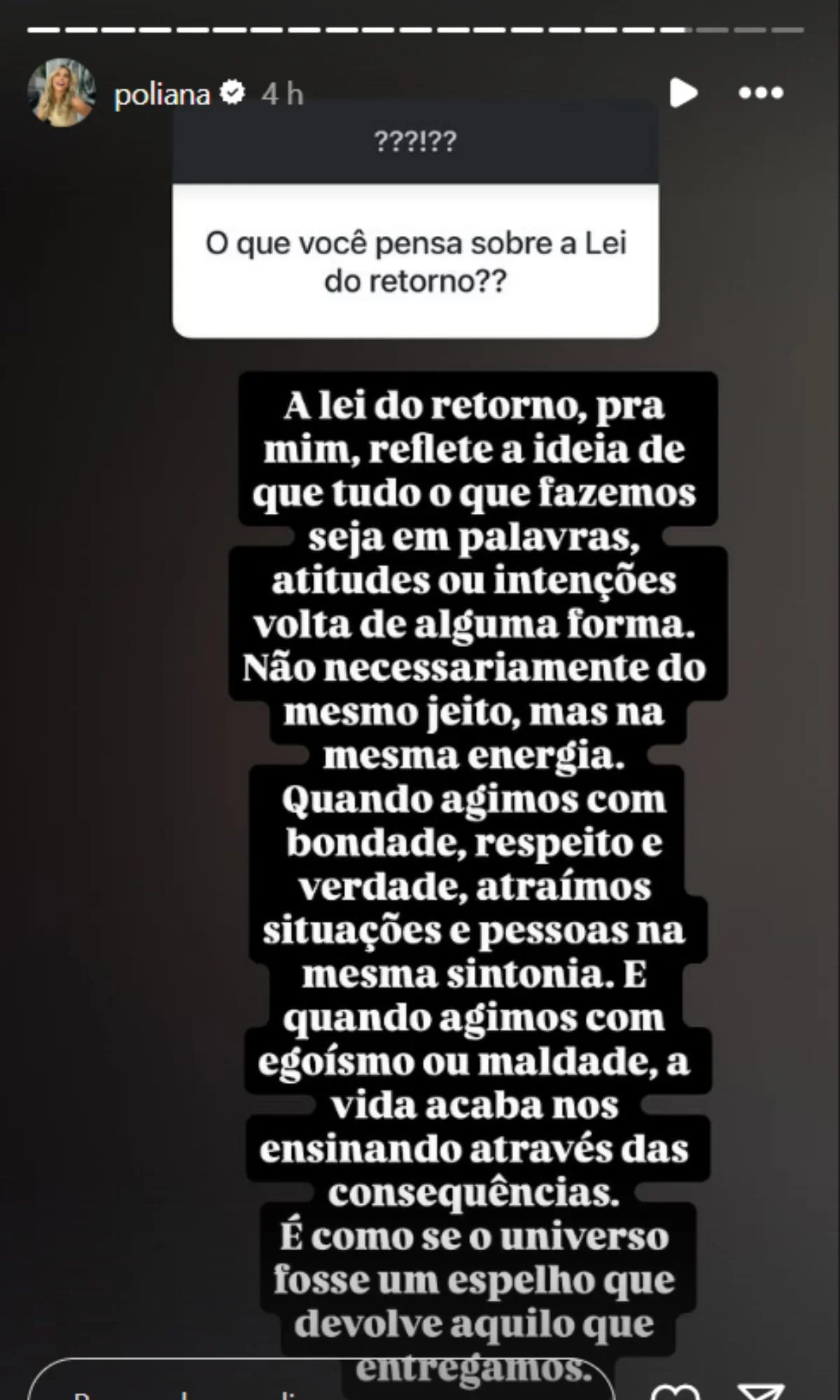 “A lei do retorno, pra mim, reflete a ideia de que tudo o que fazemos — seja em palavras, atitudes ou intenções — volta de alguma forma. Não necessariamente da mesma maneira, mas na mesma energia”, começou dizendo a esposa do cantor Leonardo.