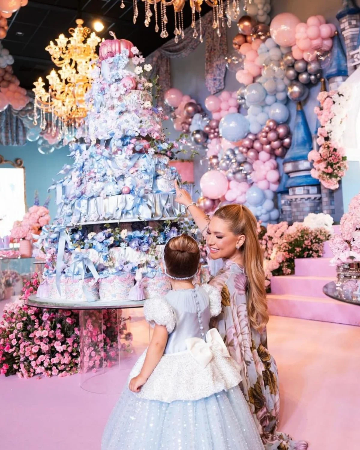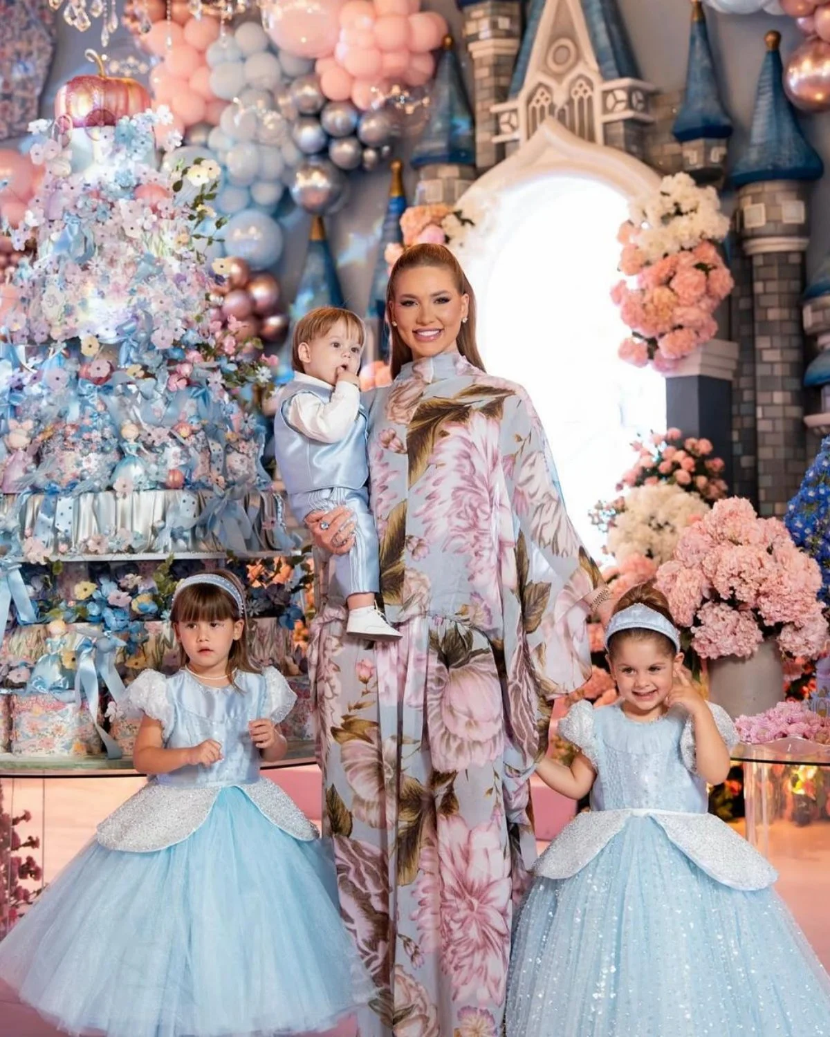 Tons de azul e rosa também marcaram a decoração, que contou com um bolo gigante, flores e um painel em formato de castelo.