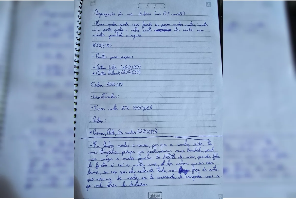 Em meio a desabafos, revelava o conflito entre a vontade de enriquecer rapidamente e o receio de decepcionar a família. “Eu preciso melhorar as minhas coisas, mas acaba que eu odeio quando algo é comprado pelos meus pais. Não tenho o menor interesse em fazer alguma coisa errada, porém quero ter minhas coisas cedo, vida boa, coisas de marca, dinheiro, mas como vou fazer isso?”, escreveu o jovem em uma das páginas do que se tornou uma espécie de diário.