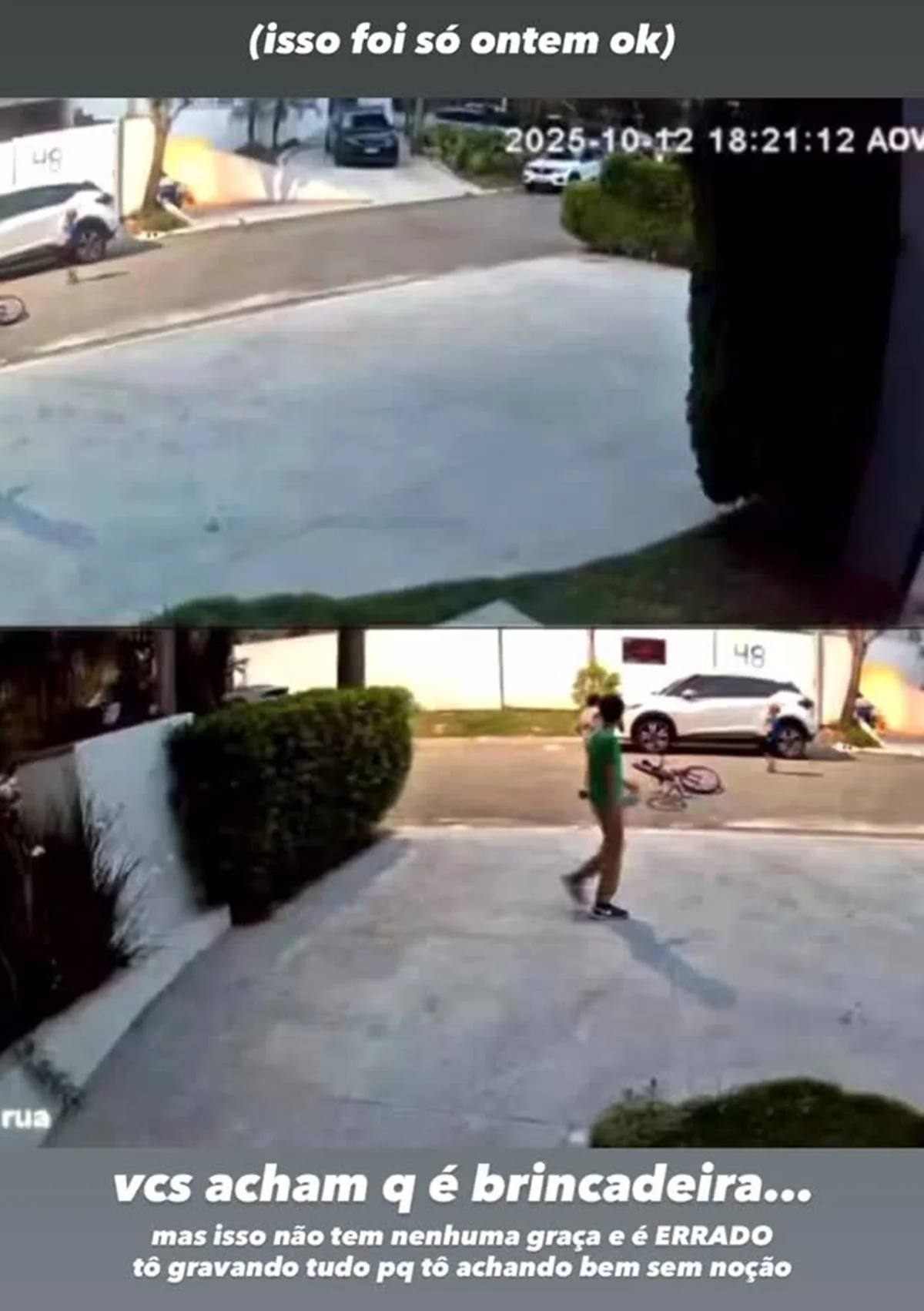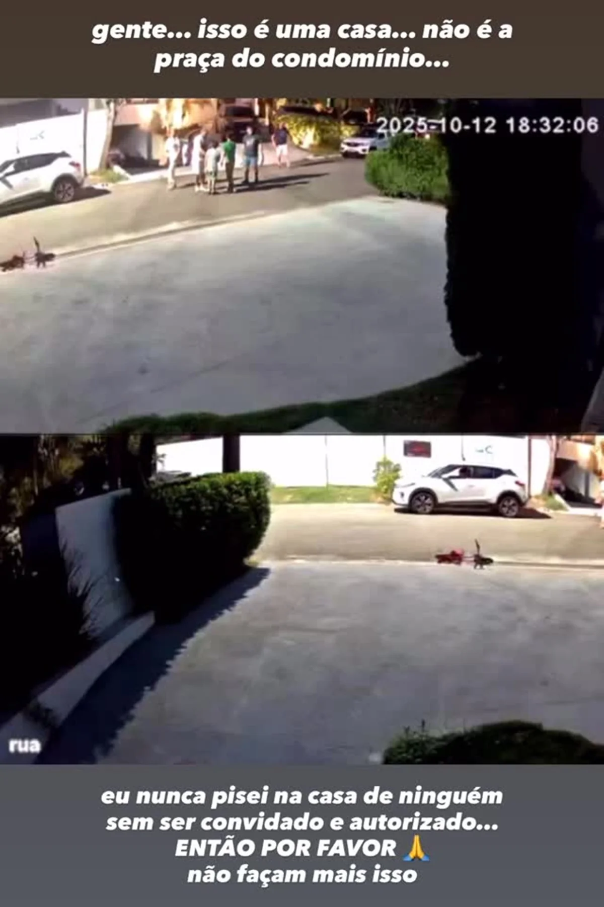 Logo depois, o cantor publicou mais flagrantes. Nas imagens, é possível ver uma mulher, um homem e algumas crianças em frente à casa do ator. Em determinado momento, o cachorro é solto e dão ordem para que ele desça na garagem.