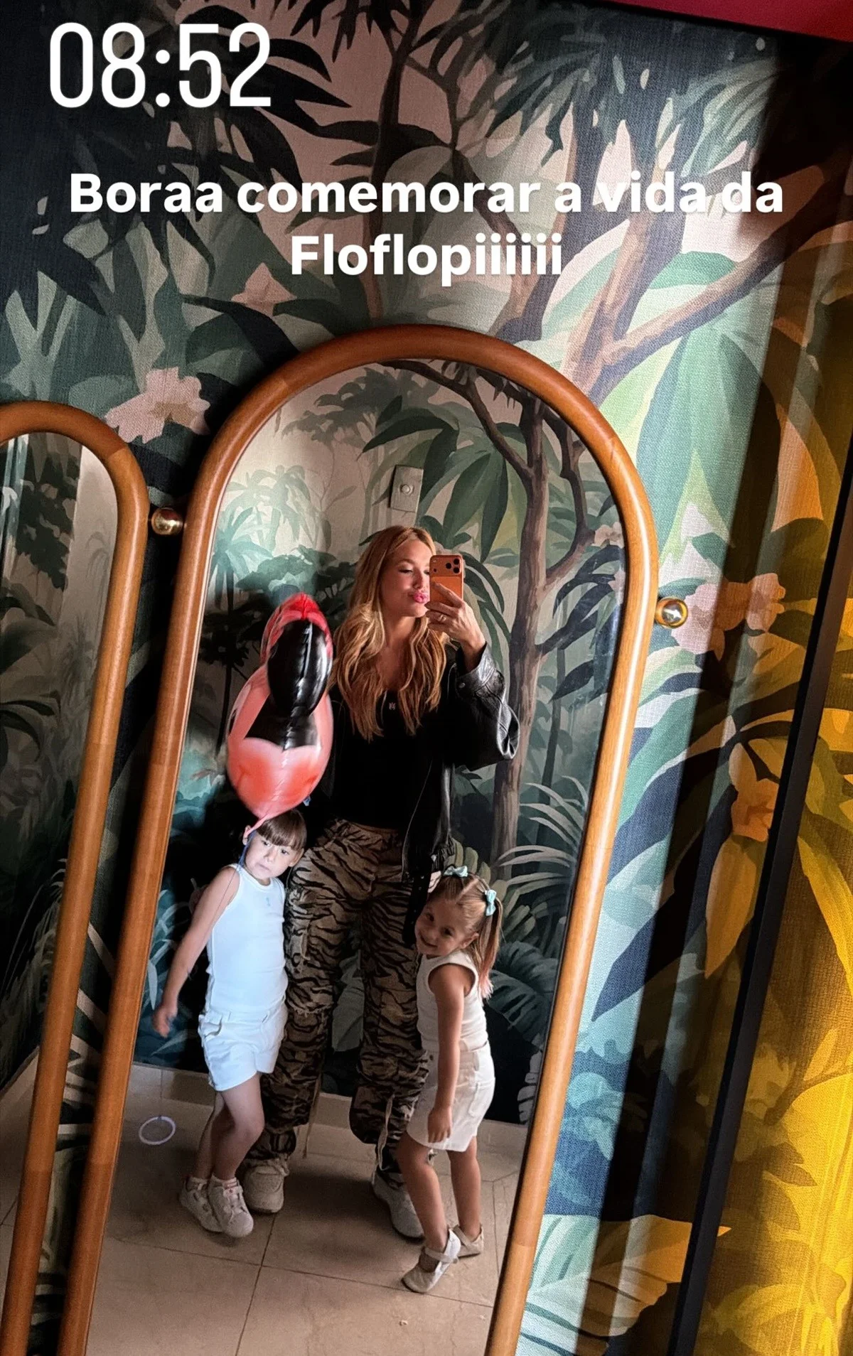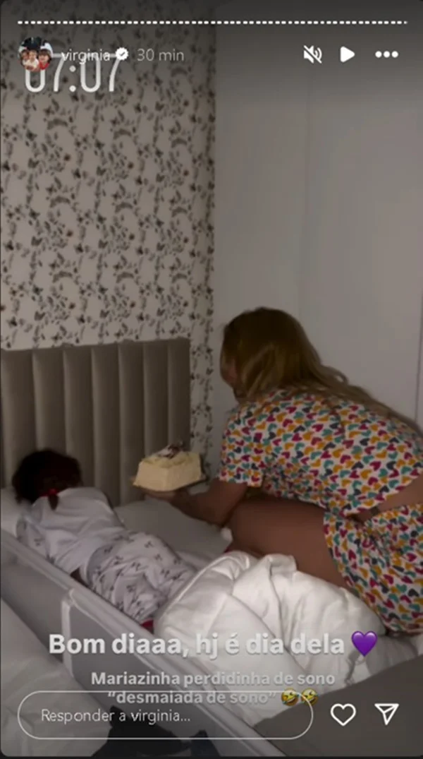 “É aniversário da Flo Flo! Vem cá, Maria, cantar parabéns para a irmã”, disse Virginia Fonseca, tentando despertar as filhas. A cena ficou ainda mais divertida quando Maria Alice, de 4 anos, com preguiça, disparou: “Desmaiada de sono”.