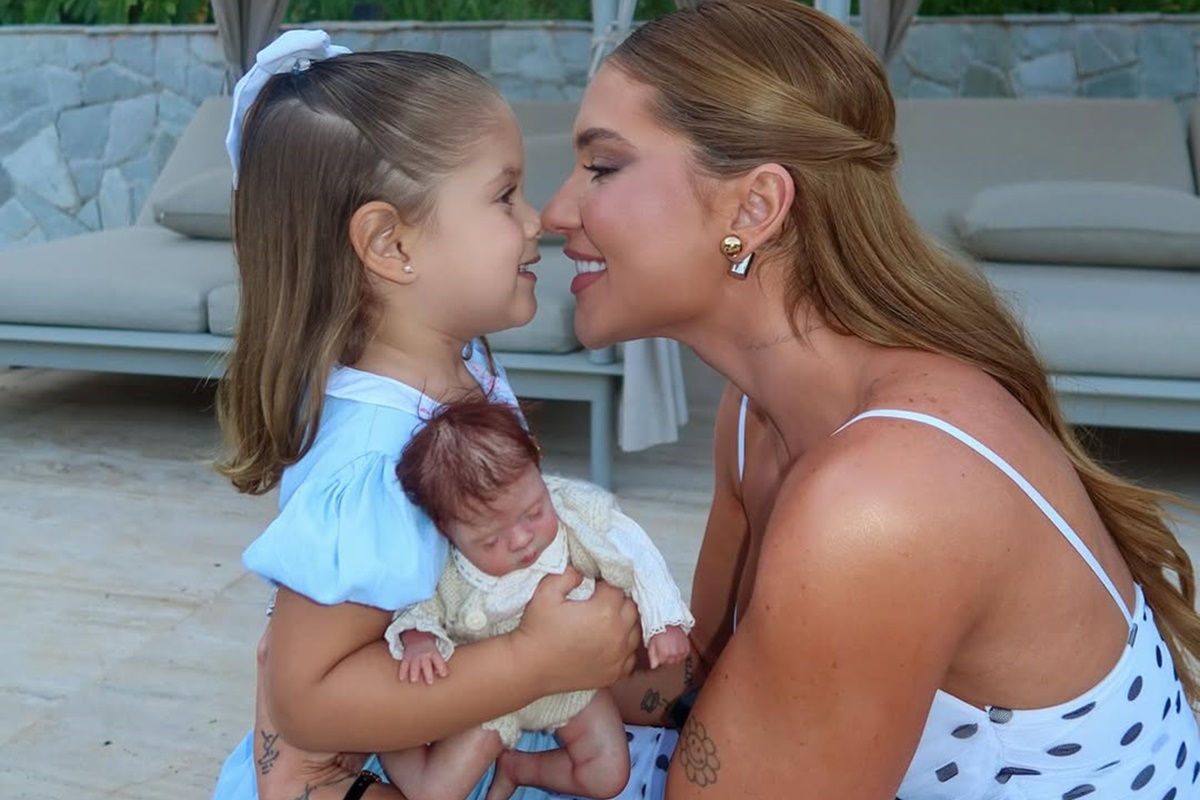 Maria Flor, filha de Zé Felipe e Virginia, posa com a boneca que ganhou de Ana Castela