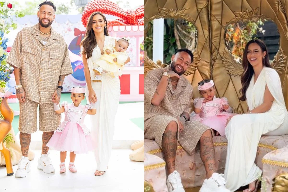 Neymar e Mavie posam durante o aniversário de 2 anos da menina