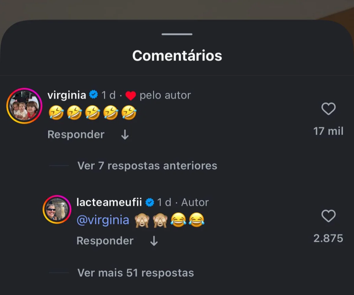 Nos comentários do post, Virginia Fonseca marcou presença e reagiu com leveza à brincadeira, deixando emojis de risada na publicação.