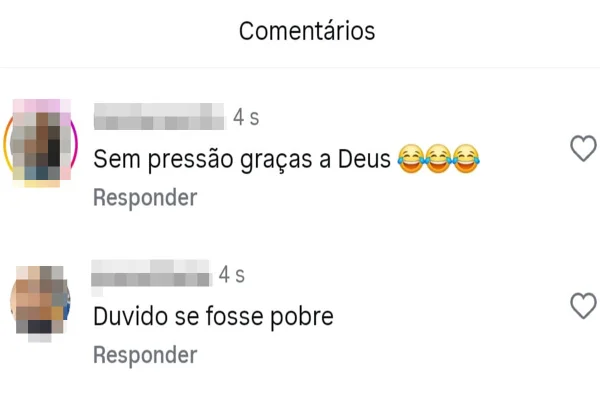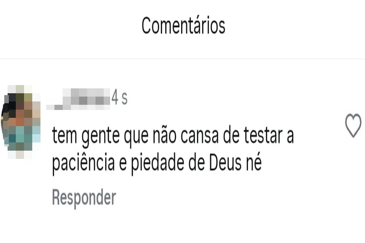 “Sem pressão, graças a Deus”, observou uma. “Tem gente que não cansa de testar a paciência de Deus, né?”, escreveu outra. “Ai, que breguice”, disparou uma terceira.