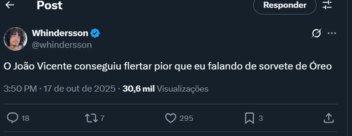 Diante da troca de mensagens picante, Whindersson Nunes se manifestou. No seu perfil do X, antigo Twitter, o ex-marido de Luísa Sonza debochou do “flerte” de João Vicente de Castro: “O João Vicente conseguiu flertar pior que eu falando de sorvete de Óreo”, brincou o famoso.