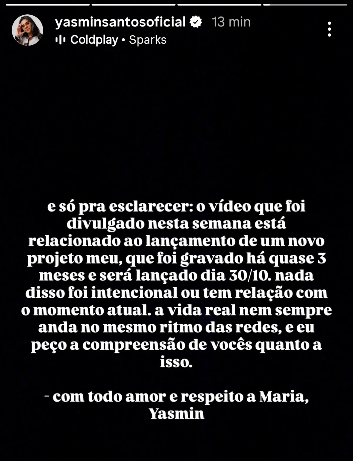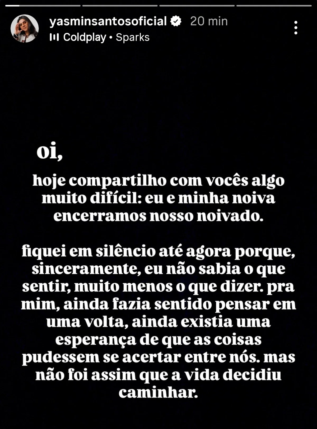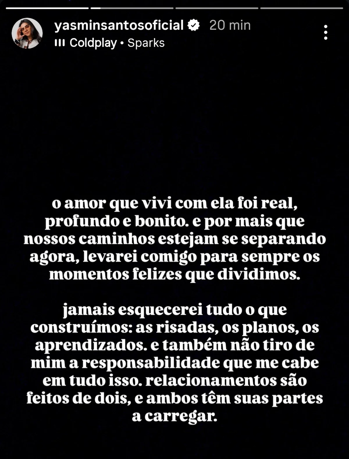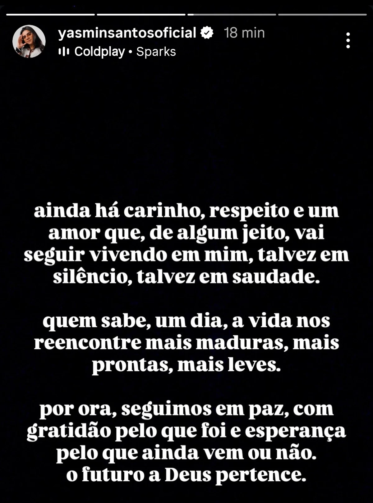 “Ainda há carinho, respeito e um amor que, de algum jeito, vai seguir vivendo em mim, talvez em silêncio, talvez em saudade. Quem sabe, um dia, a vida nos reencontre mais maduras, mais prontas, mais leves. Por ora, seguimos em paz, com gratidão pelo que foi e esperança pelo que ainda vem ou não. o futuro a Deus pertence”, completou Yasmin.