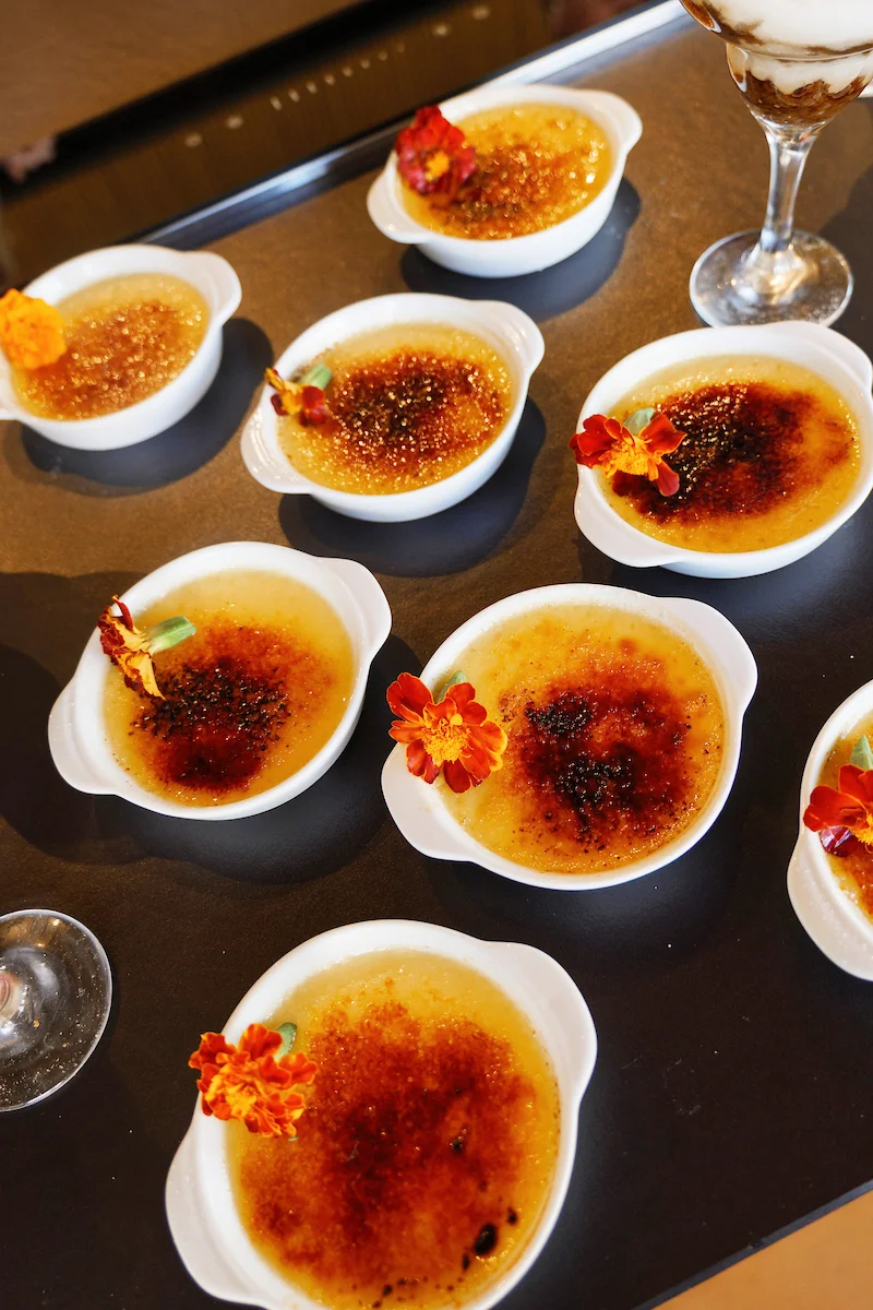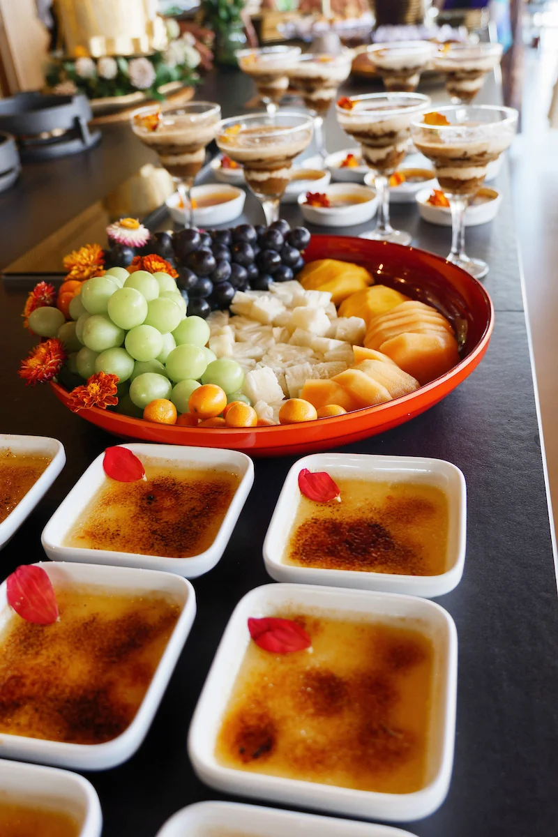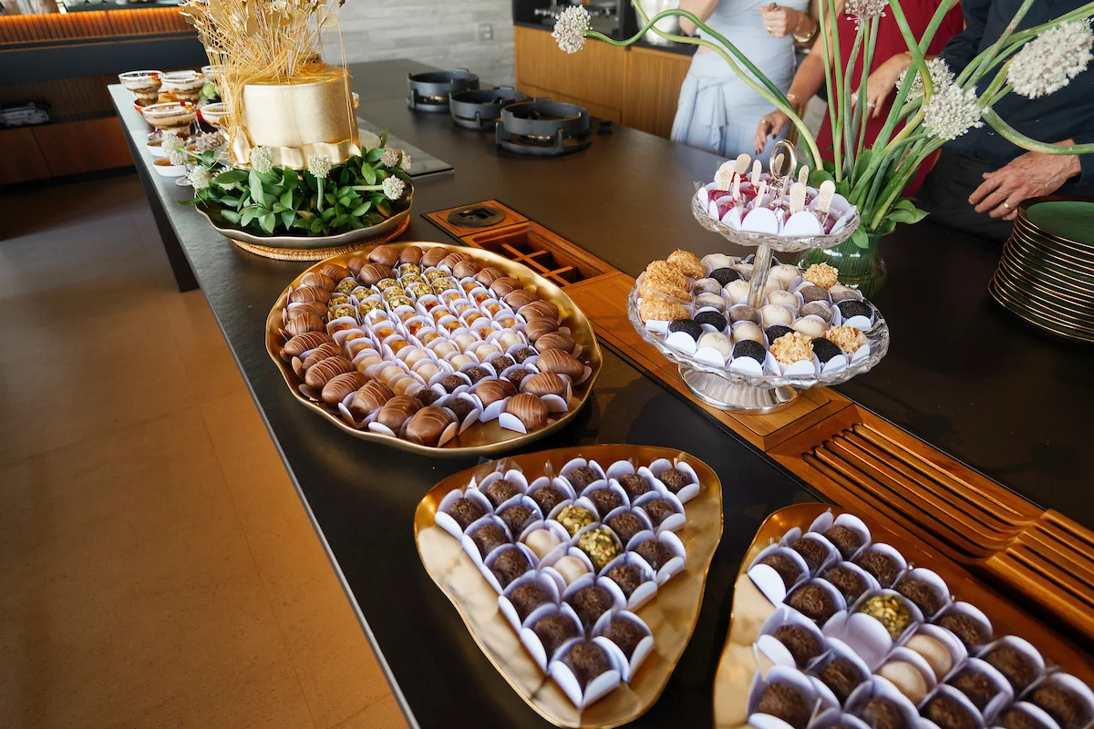 Para adoçar, foram servidos bombons variados, além de frutas da estação, tiramisu na taça e crème brûlée de rosa e baunilha.