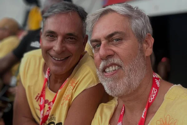 Anderson Muller e o marido, Paulinho, posam juntos em um camarote